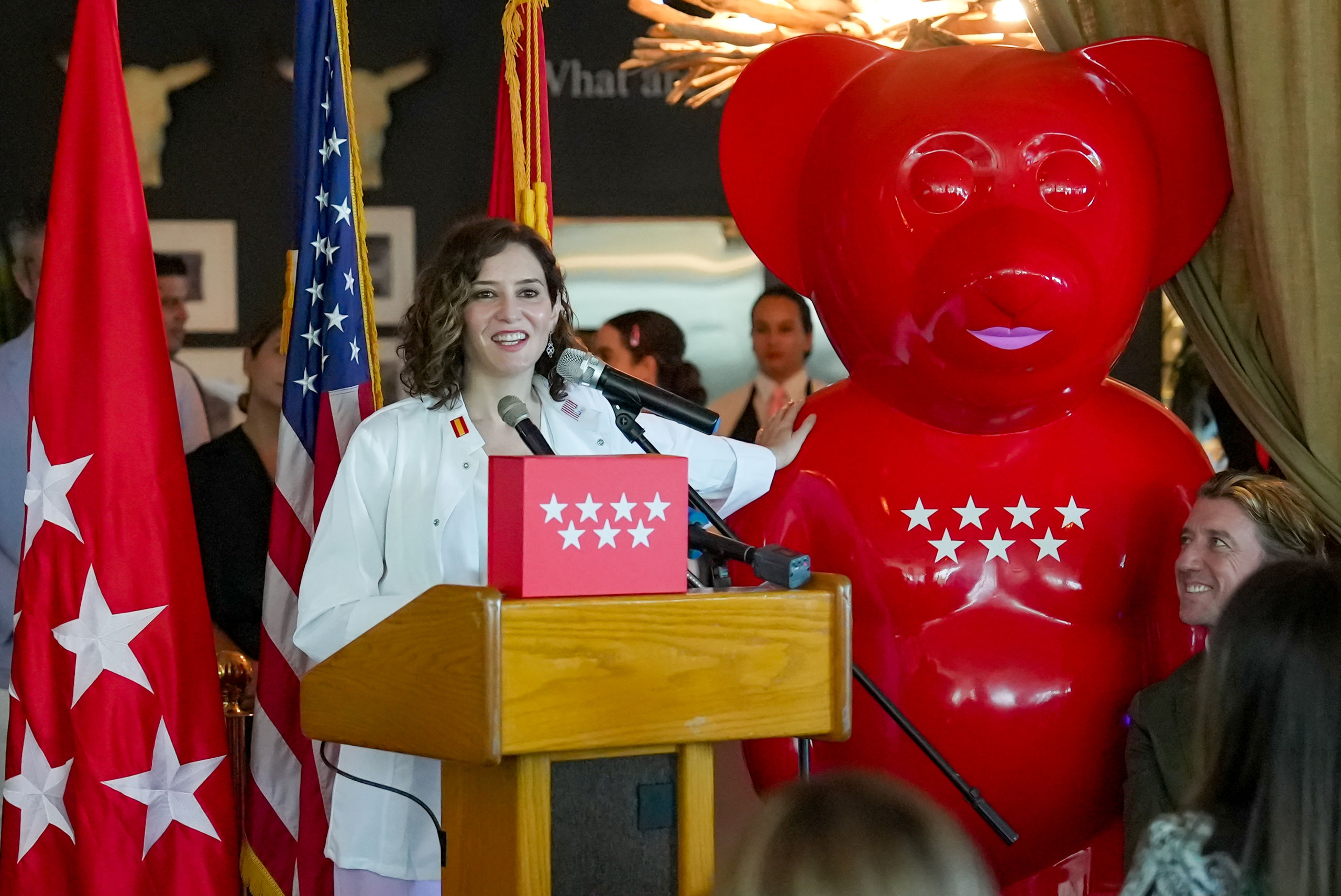 Antes del encuentro, la presidenta ha visitado una rotonda que llevará en breve el nombre de la Comunidad de Madrid y donde se instalará una escultura del artista español Eladio de Moro dEmo. Se trata de uno de sus populares osos, de color rojo y unos dos metros de altura, con la bandera de la Comunidad de Madrid pintada.
