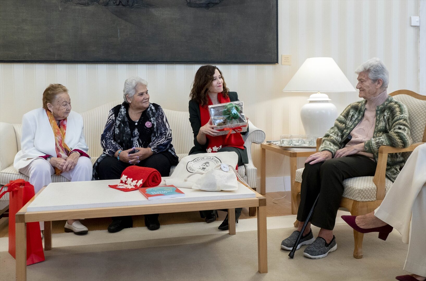 La presidenta de la Comunidad de Madrid mantuvo este lunes un encuentro en la Real Casa de Correos con un grupo de usuarios de la residencia de mayores Amavir Nuestra Casa –Collado Villalba que participan en el proyecto Tejiendo Solidaridad.