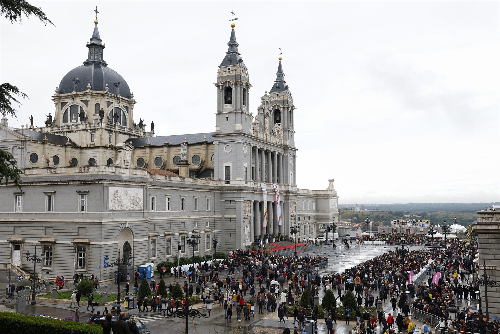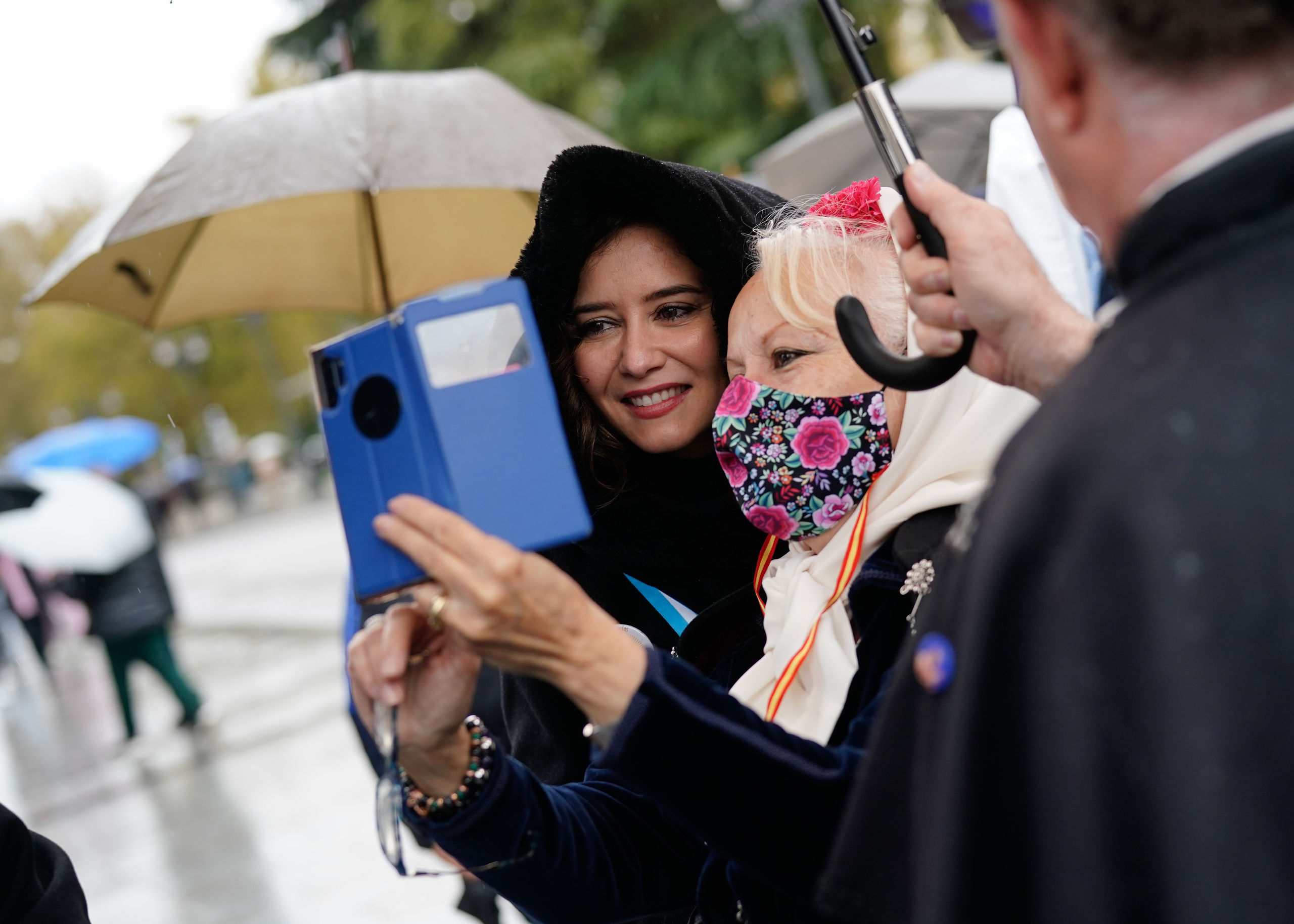 La presidenta de la Comunidad de Madrid se hace fotos a las puertas de La Almudena con personas que se acercaron a pedírselo.