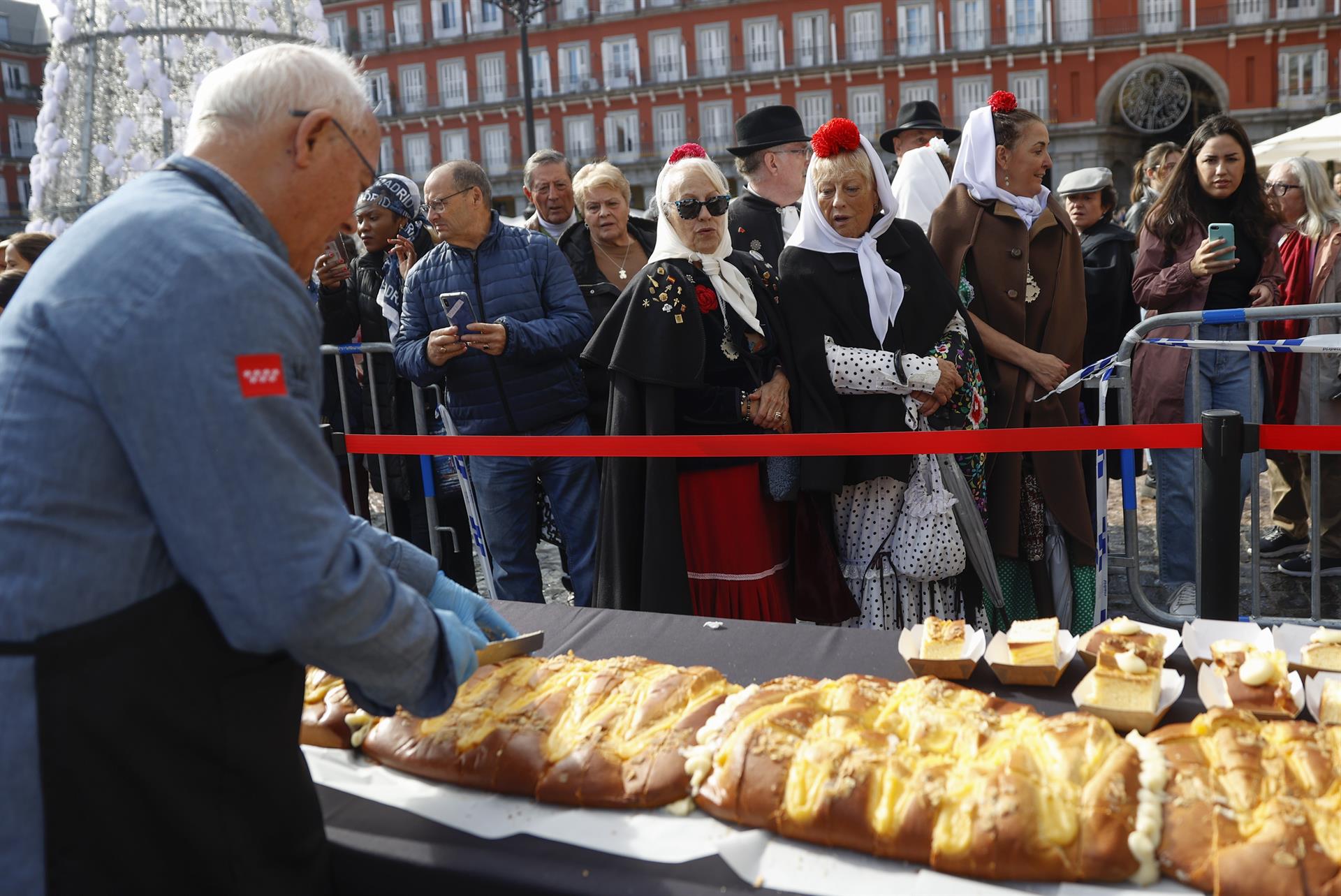 Degustación de una corona de la Almudena de 17 metros de longitud en la Plaza Mayor de Madrid.
