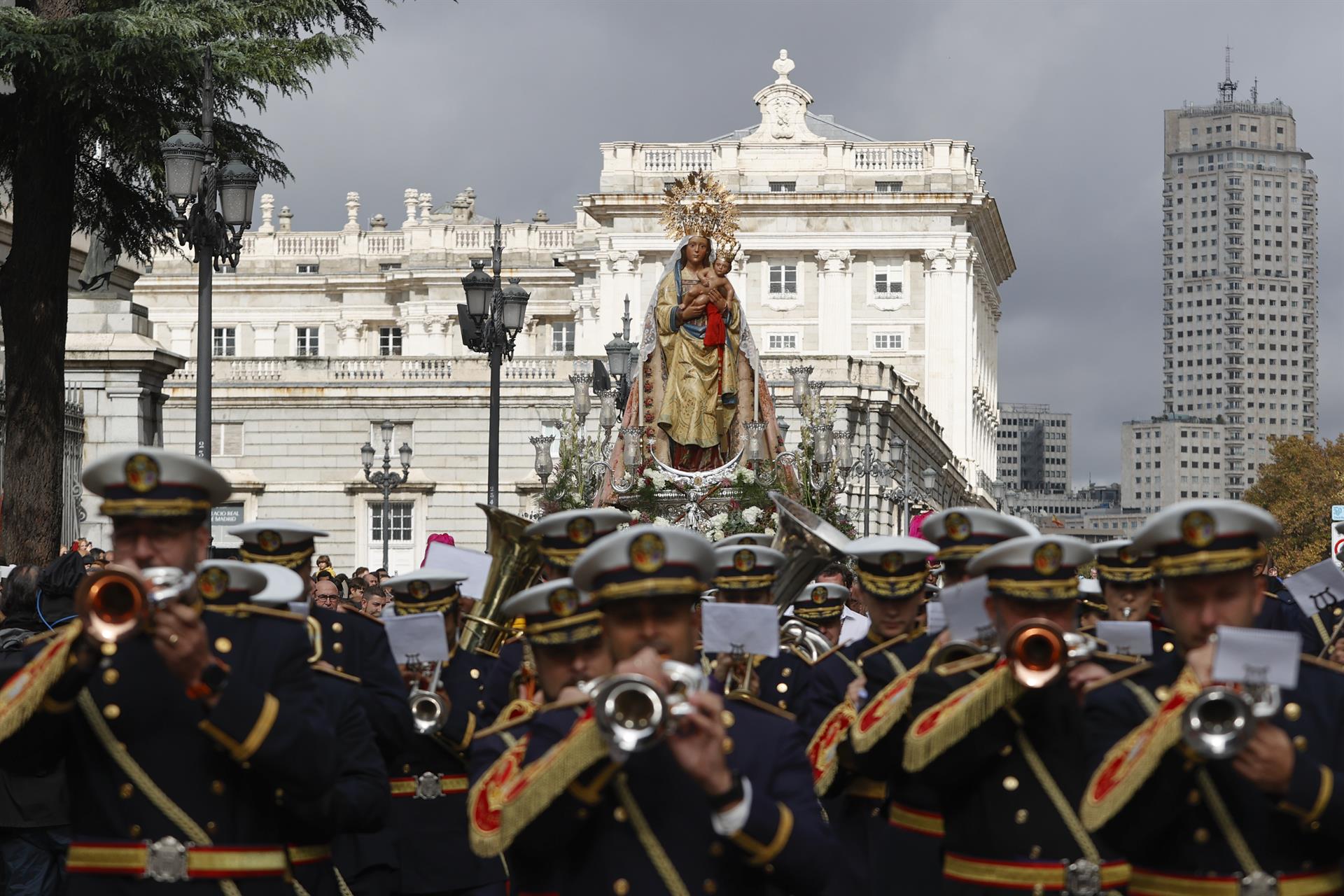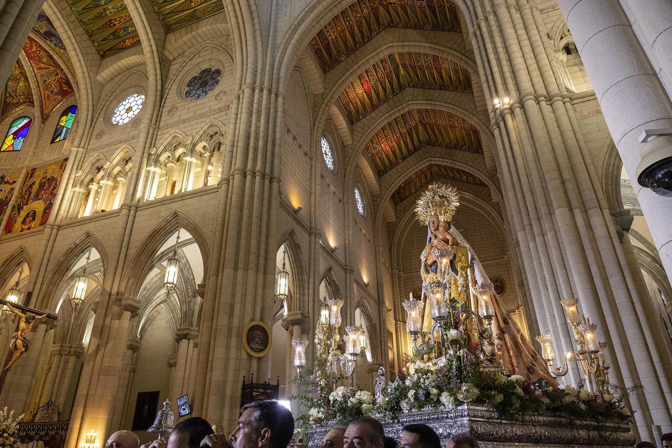 La imagen de la Virgen de La Almudena es sacada en procesión, este miércoles, en Madrid.