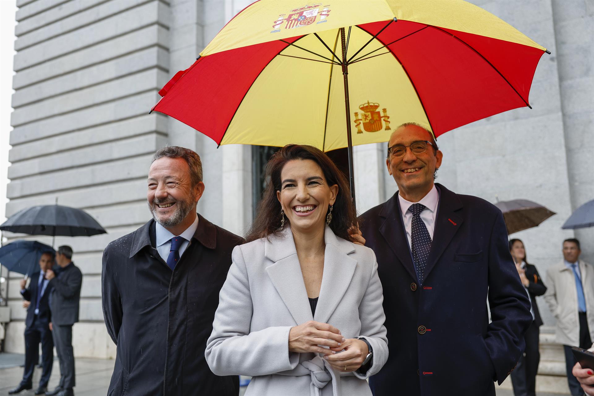 La portavoz de Vox, Rocío Monasterio, junto a otros diputados del partido en la Asamblea, a su llegada a la catedral.