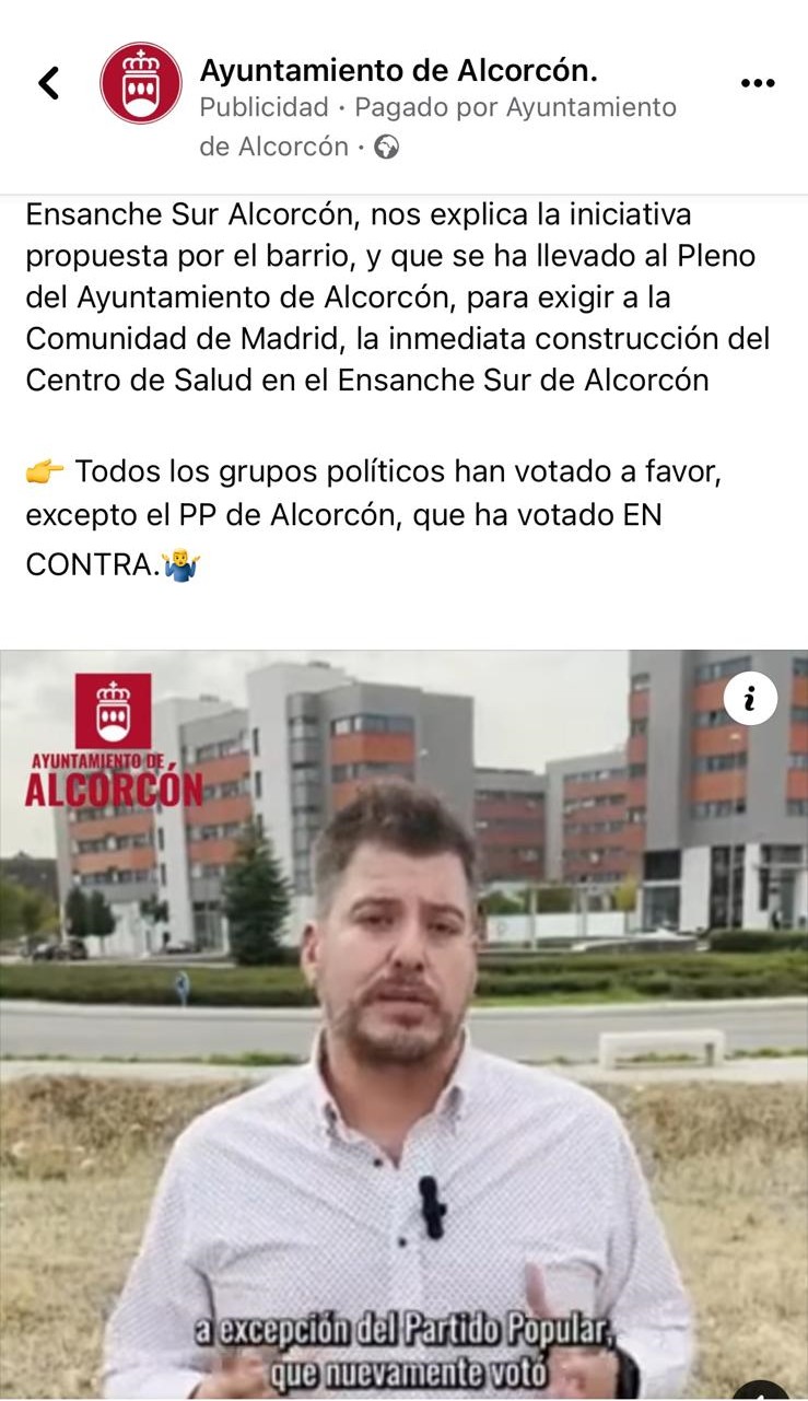 Se trata de un vídeo promocional de 1 minuto y 23 segundos en el que el concejal de Urbanismo, Obras Publicas y Mantenimiento, y cuarto teniente de alcalde de la ciudad arremete contra la presidenta madrileña porque "después de 13 años pidiéndole a la Comunidad de Madrid la instalación de un centro de salud en el Ensanche Sur todo sigue igual". Y pone este hecho en contraposición a la labor del gobierno municipal: "Todas las numerosas actividades culturales que hemos llevado a cabo tanto en el verano como durante las fiestas patronales" en la zona así como otras mejoras, como "el asfaltado de la avenida Primera de Mayo", que se encuentra en dicho barrio.