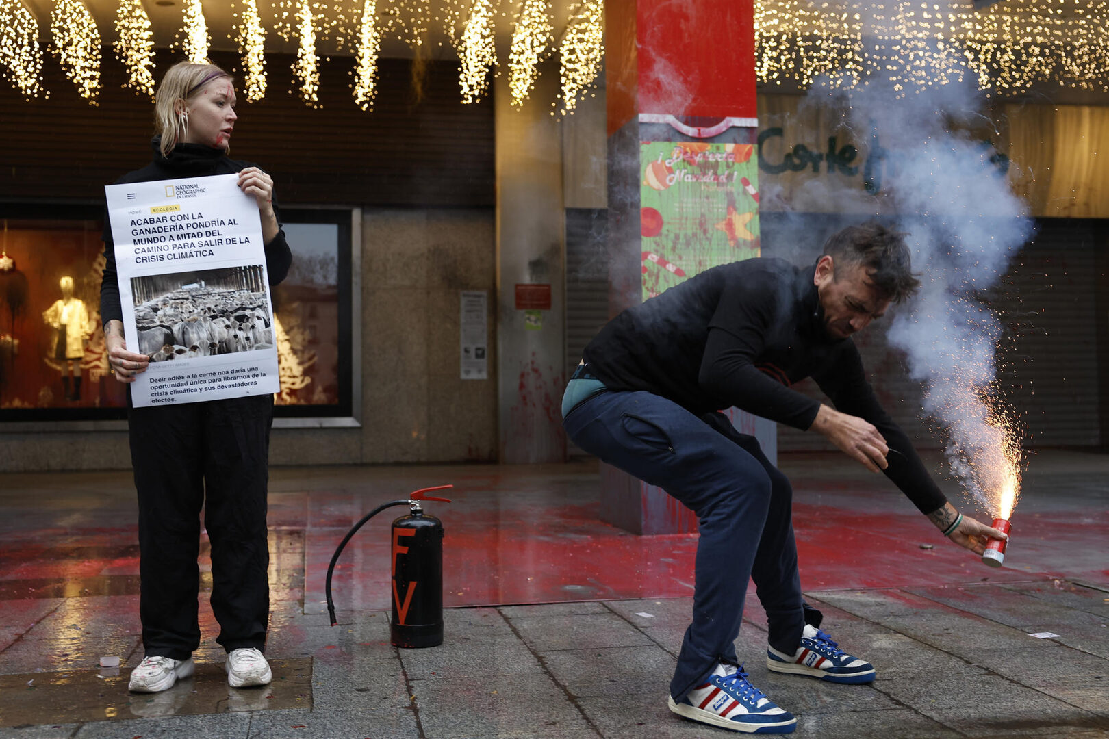 Proponen "cambiar la ética de la abundancia", aseguran los miembros del grupo que este jueves -día en el que se celebra la festividad de la Inmaculada- han rociado con pintura roja y negra parte del escenario del espectáculo navideño infantil que adorna la fachada de los grandes almacenes, asustando a los viandantes que pasaban por la zona.