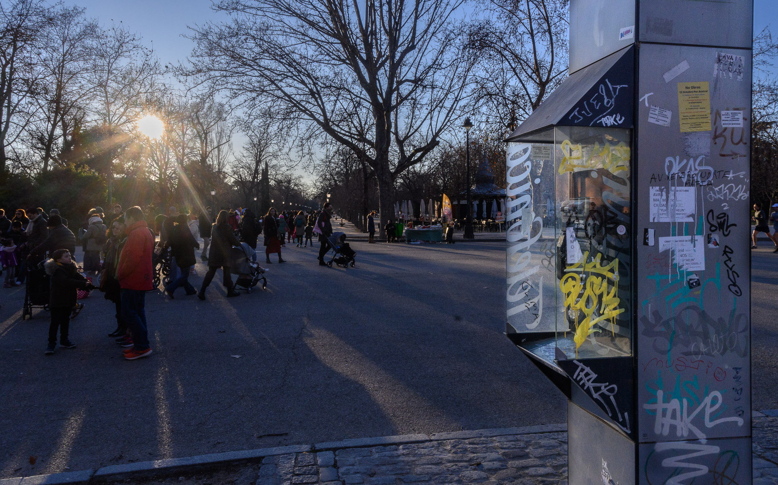 Dos personas pasan junto a una destrozada cabina al inicio de la calle Génova.
