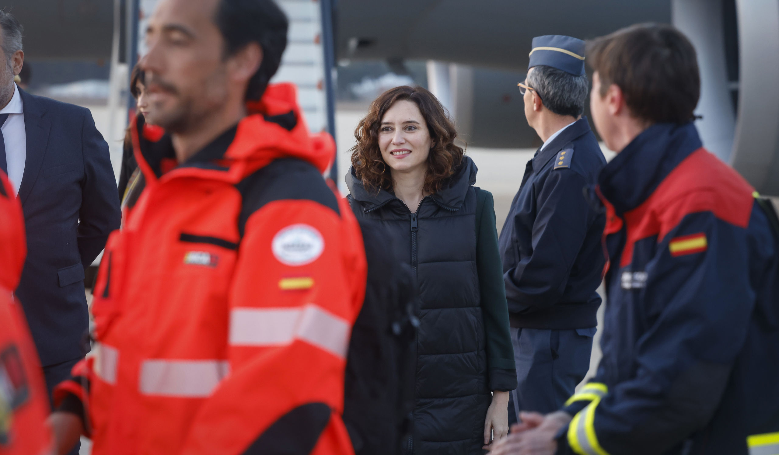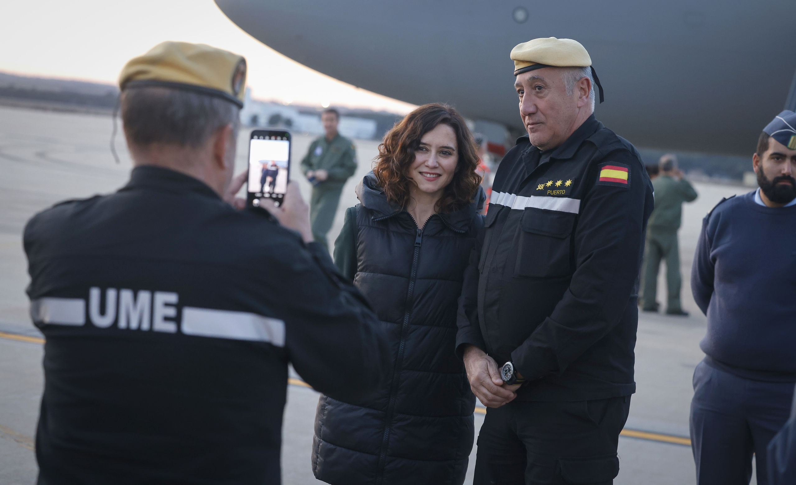 La jefa del Ejecutivo autonómico ha dado la bienvenida al contingente madrileño que ha aterrizado junto a los miembros de la Unidad Militar de Emergencias (UME), que también han participado en este despliegue.