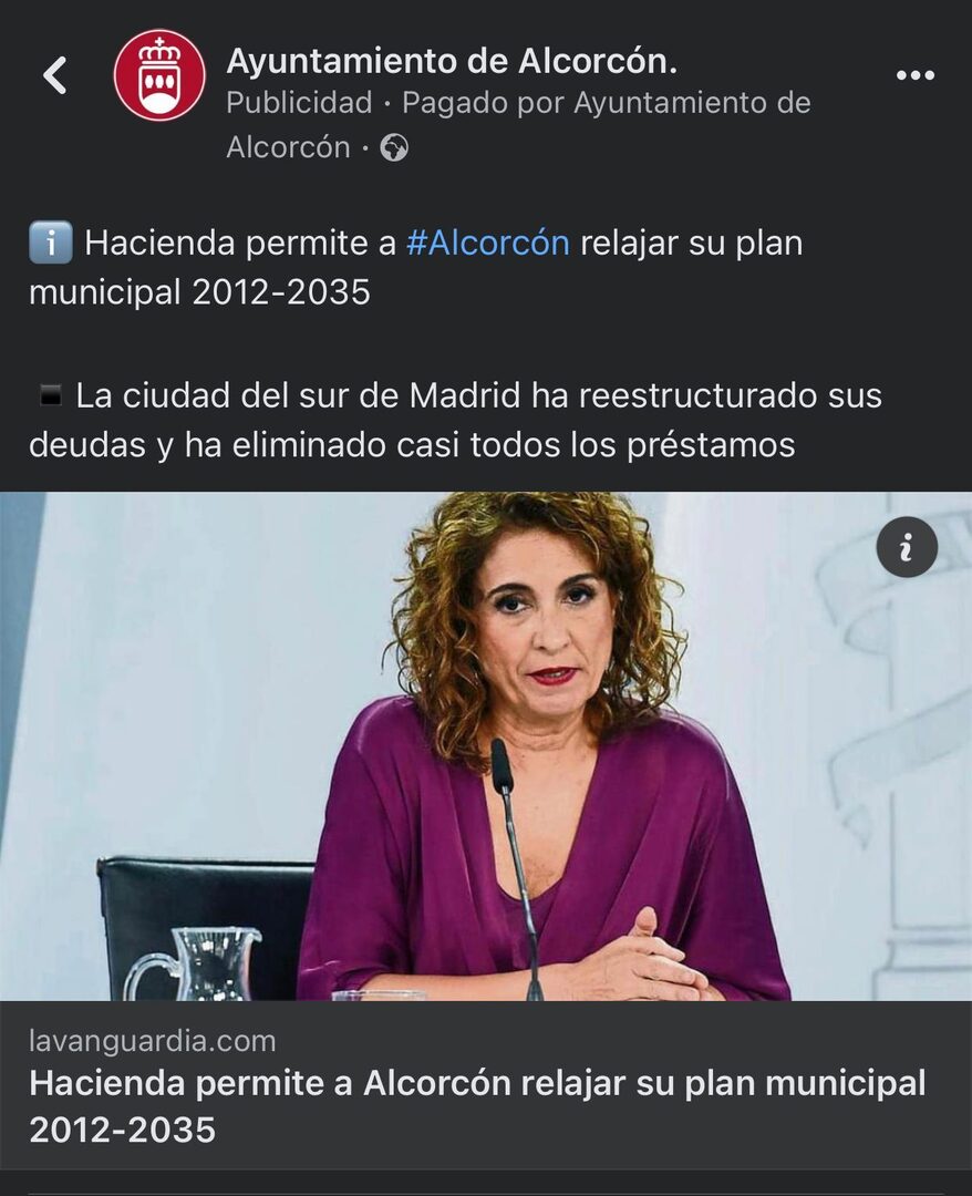 El Ayuntamiento de Alcorcón, a través de publicidad pagada en Facebook, está promocionando que el Ministerio de Hacienda le ha permitido aplazar dos años más el pago de la deuda que fue dejada por el Partido Socialista en 2011. Esa deuda ascendió a 612 millones de euros, lo que obligó en 2012 al Ayuntamiento alfarero a establecer un plan de ajuste hasta el año 2033.