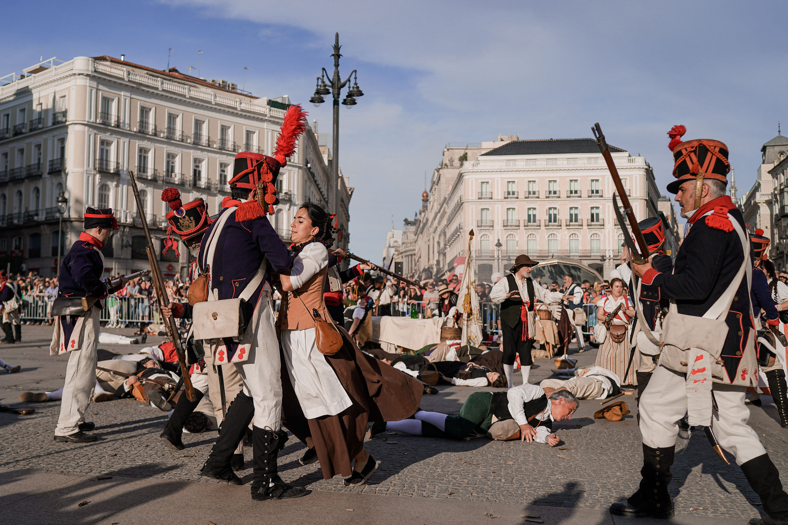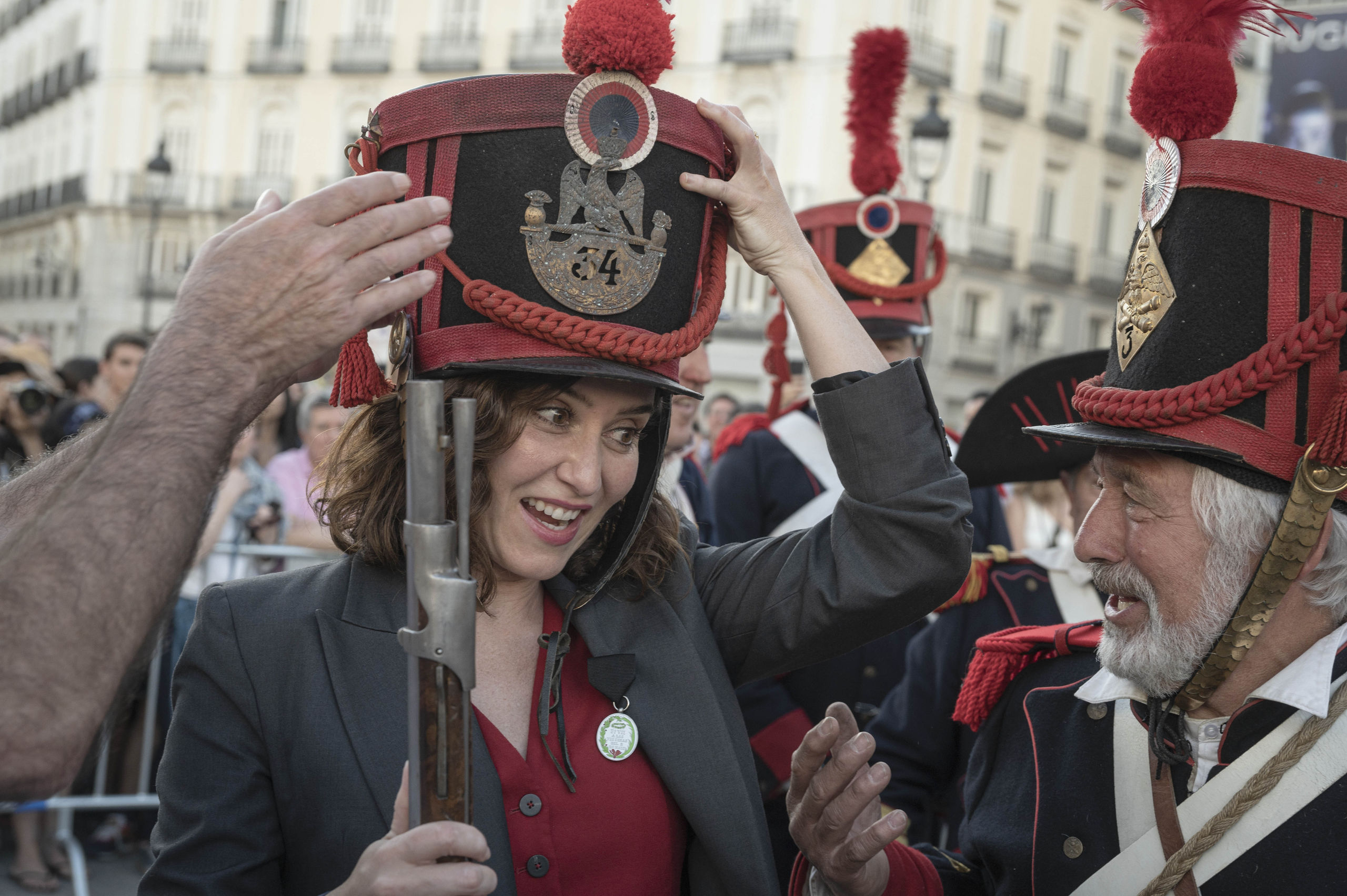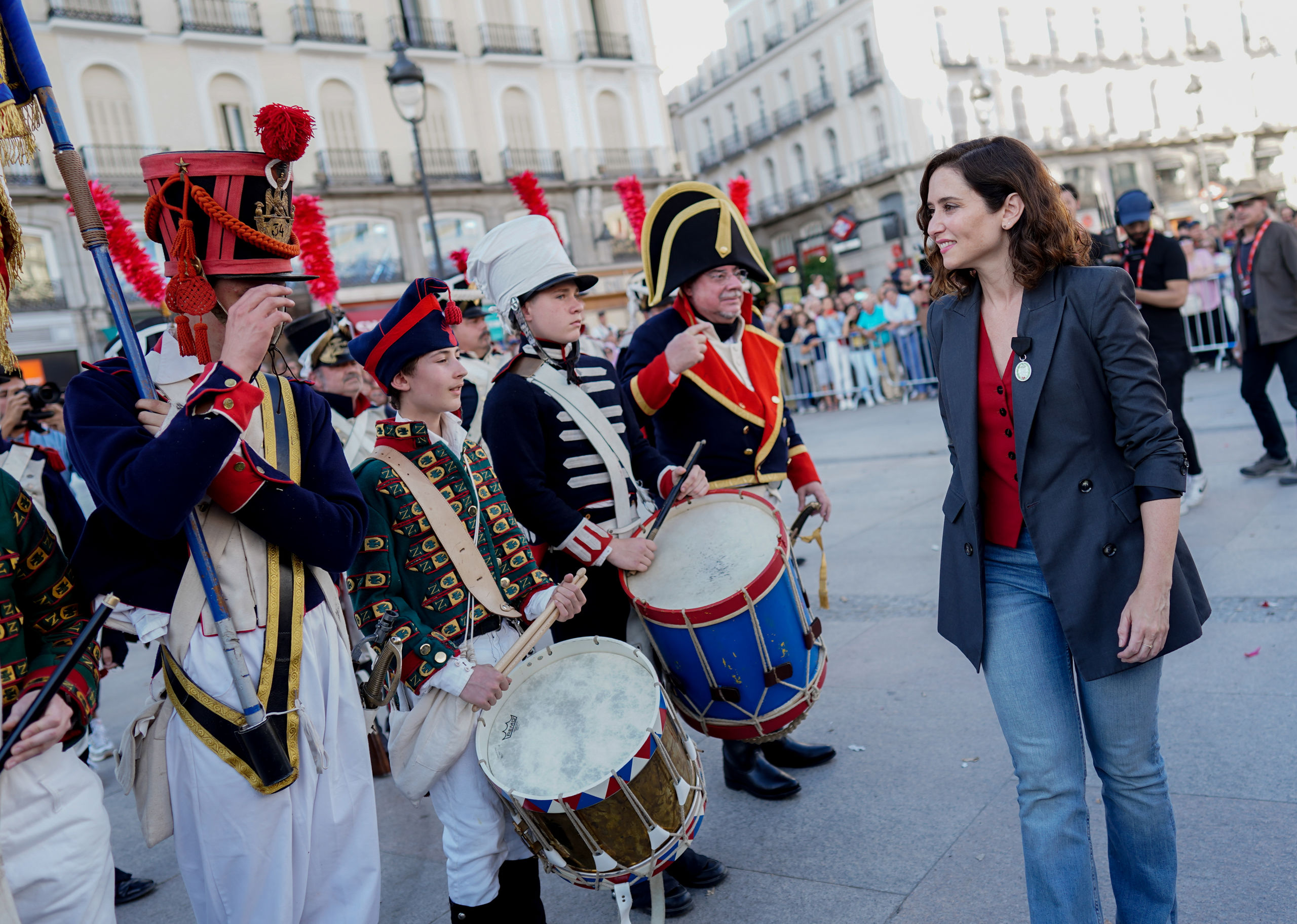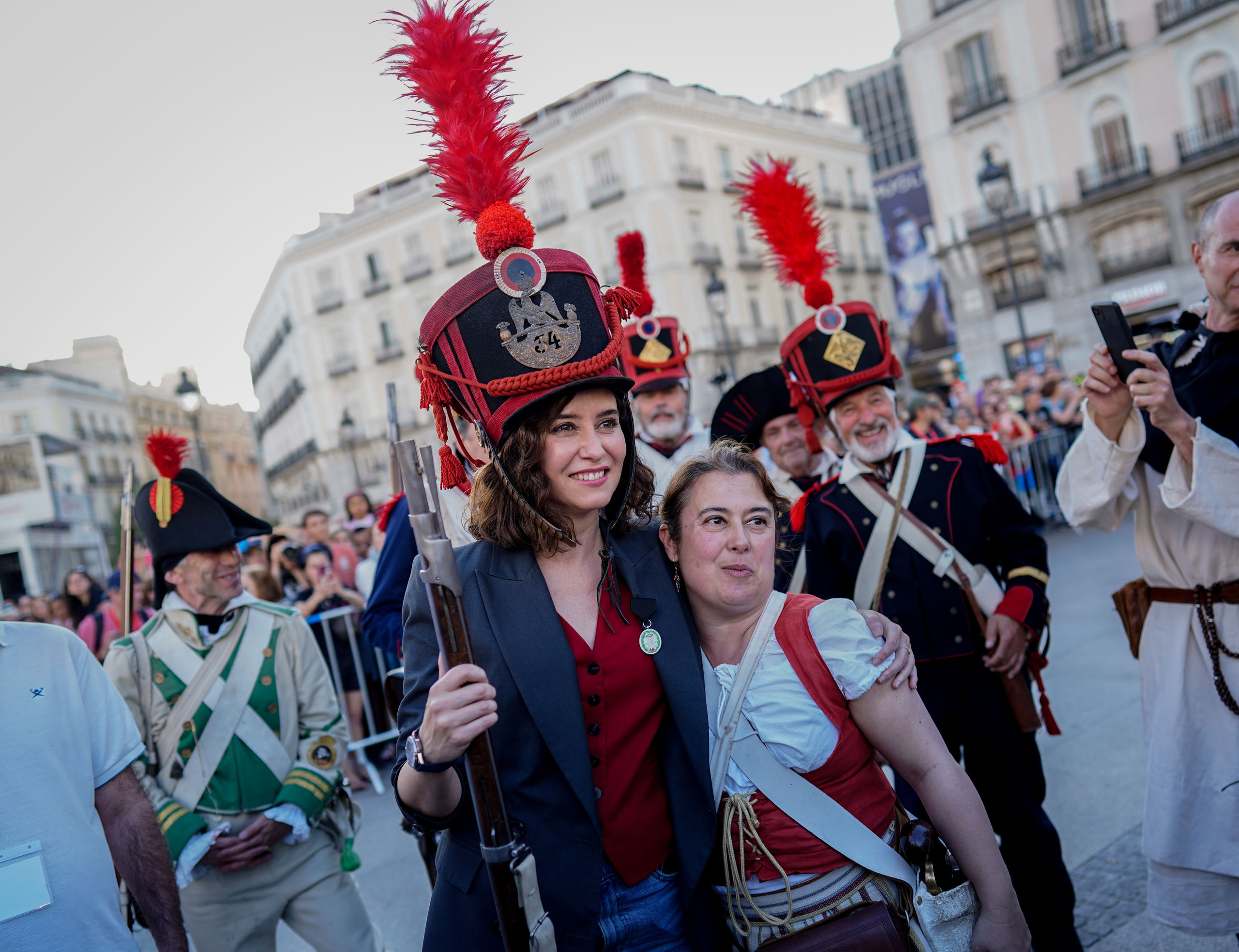 La presidenta de la Comunidad de Madrid, Isabel Díaz Ayuso, ha asistido este lunes en la Puerta del Sol a la recreación histórica de la defensa del cuartel de Monteleón, episodio que formó parte del Levantamiento del 2 de Mayo de 1808 de la Guerra de la Independencia.
