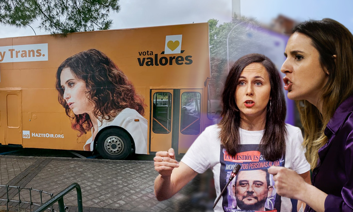 Pero el acoso a la candidata a la reelección durante esta campaña también llega de la derecha. Y es que allá donde va Ayuso le persigue un gran autobús naranja de HazteOír --organización que, según documenta El Retorno de la Derecha de Federico Jiménez Losantos, está vinculada a El Yunque--. También lo ha hecho este viernes, plantándose a las puertas de esRadio, con la particularidad de que en esta ocasión se bajaron del mismo tres activistas de la asociación, que bajo la lluvia sujetaron una pancarta en la calle con el siguiente mensaje: "Ayuso está a favor de la libertad para asesinar bebés (ley del aborto) y mutilar niños (ley trans)".