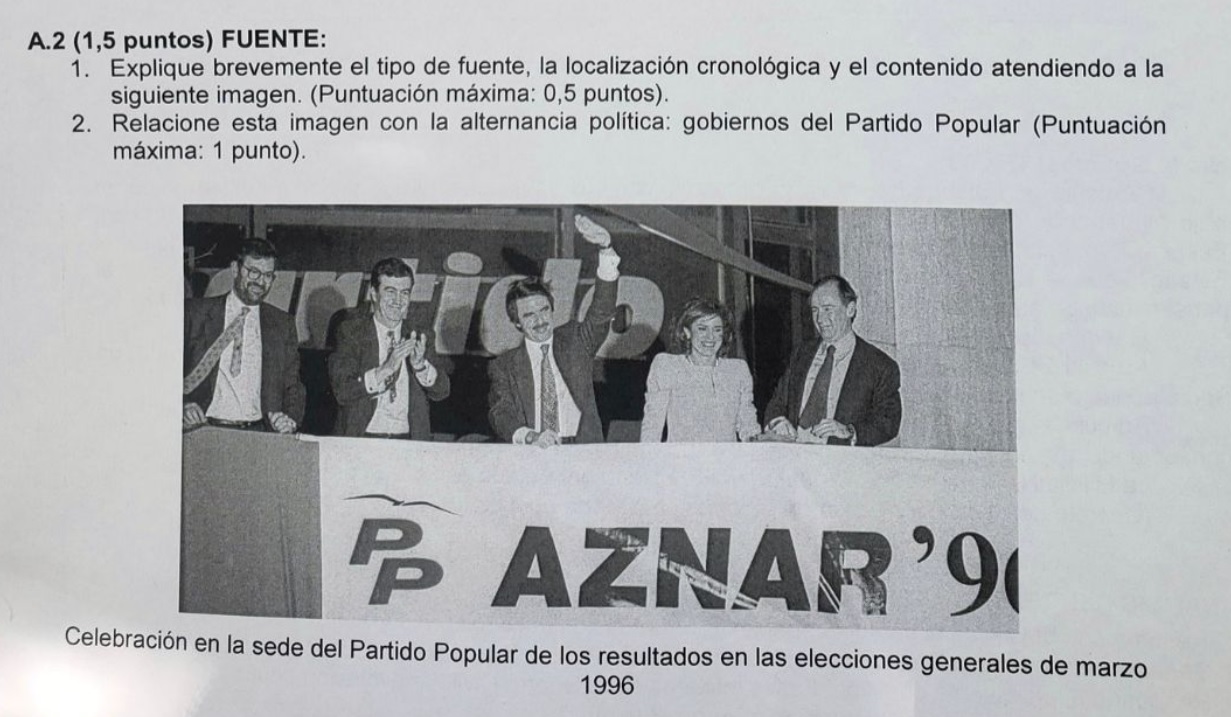 Los alumnos madrileños debían escoger entre dos opciones. La primera trataba sobre el periodo de la Restauración. La segunda incluía la fotografía del expresidente del Gobierno José María Aznar durante la celebración en la sede del PP de los resultados electorales de 1996 junto a la siguiente pregunta: "Relacione esta imagen con la alternancia política: gobiernos del Partido Popular".