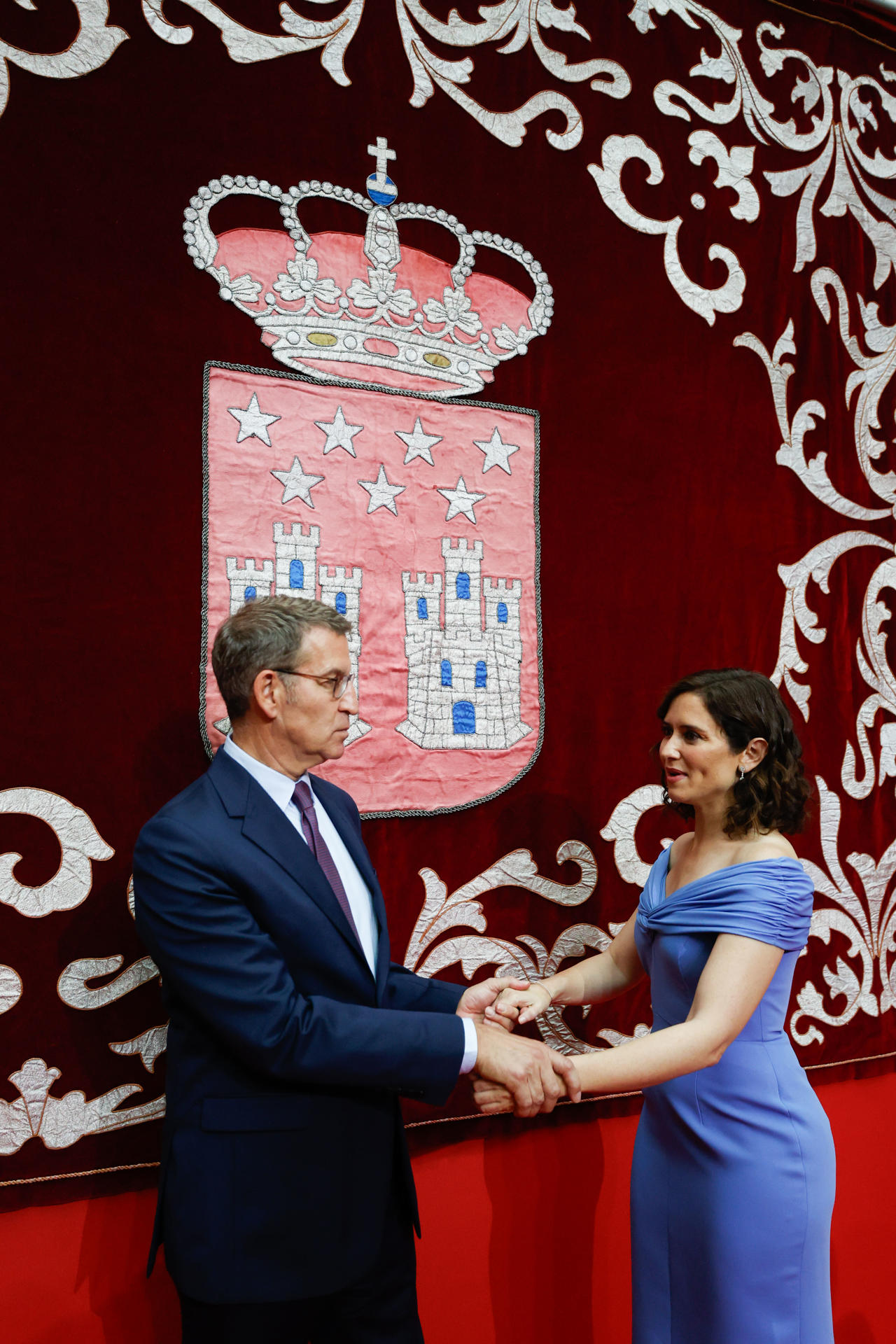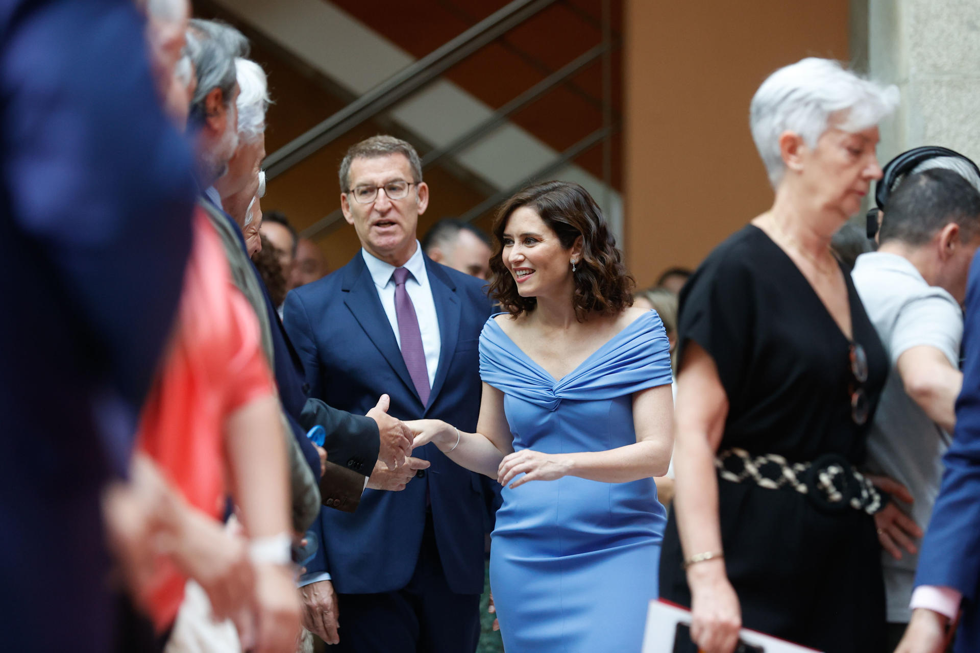 Hay que “felicitar a Ayuso por una excelente carrera política y también por unos resultados en las urnas extraordinarios. Es muy difícil en la España de hoy conseguir en menos tiempo una mayoría absoluta en una Comunidad que es el motor económico de nuestro país", dijo el presidente del PP que acudió a la investidura. “Es una presidenta valiente que dice lo que piensa y hace lo que dice. Y eso en la política actual tiene un valor enorme", añadió Alberto Núñez Feijóo, que dijo coincidir en las “líneas básicas de su discurso de investidura”. El líder del PP afirmó que su “modelo" al que “nunca renunciará" es ese, el de las “grandes mayorías" de Madrid, Andalucía, Galicia o La Rioja. “El de los gobiernos fuertes y sólidos" y por eso trabajará de cara al 23 de julio.