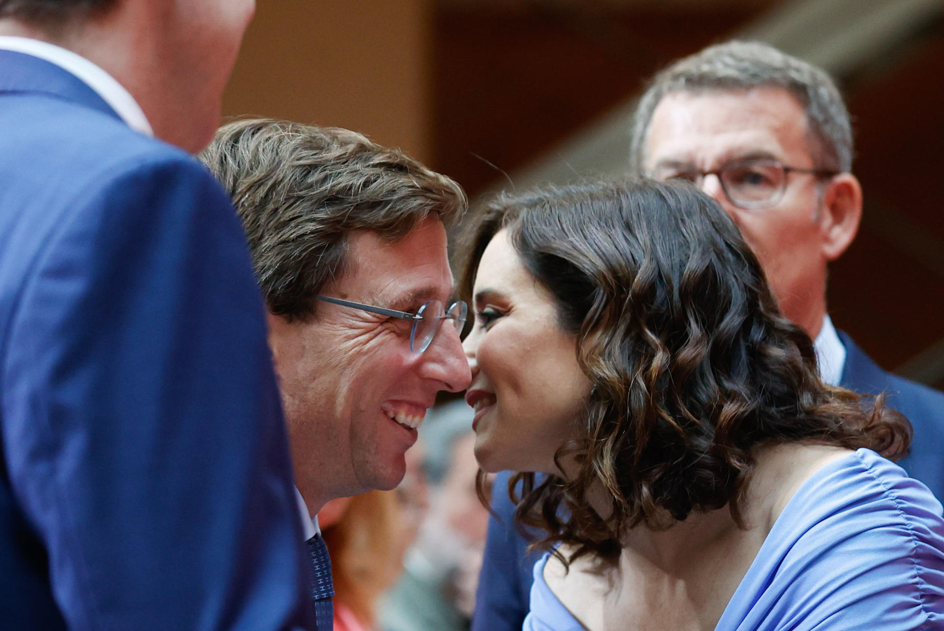 Ayuso saluda al alcalde de Madrid, José Luis Martínez Almeida, a su llegada a la Real Casa de Correos.