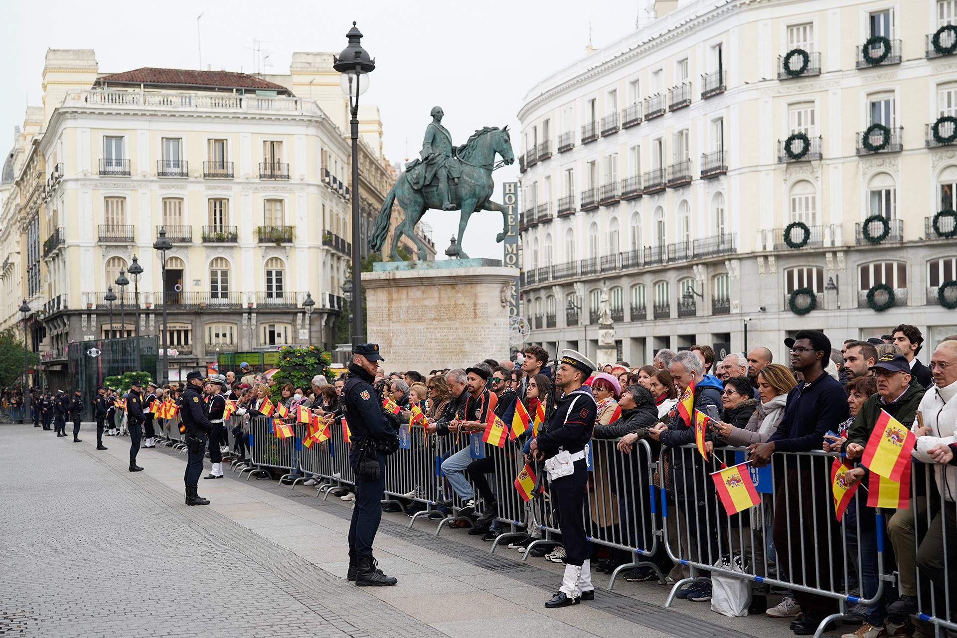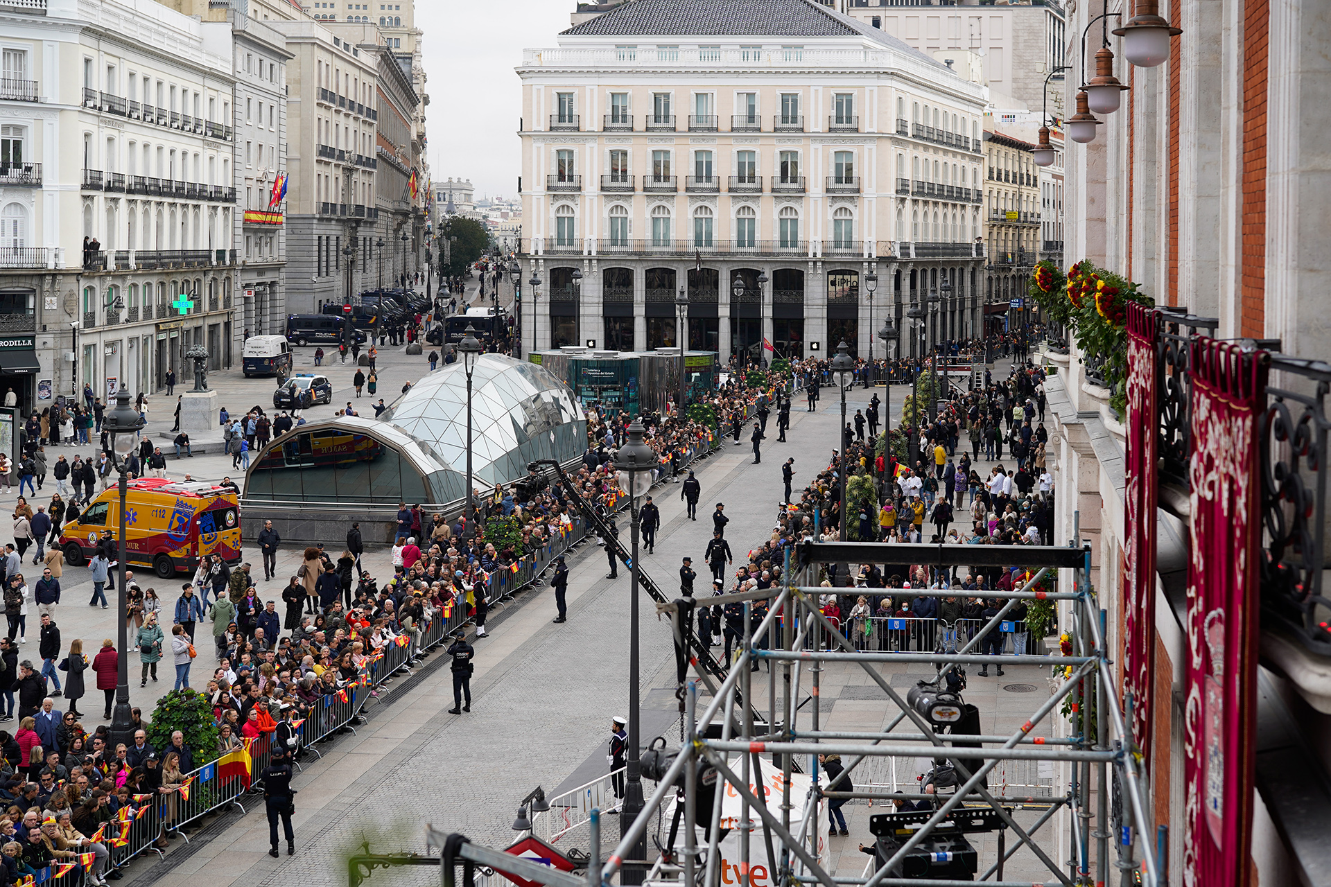 Una multitud de ciudadanos aguardan en Sol por donde pasará la comitiva real de camino al Palacio Real tras la ceremonia de jura de la Constitución de Leonor de Borbón en el día de su 18 cumpleaños, una ceremonia que representa el hito más importante de su trayectoria institucional y pavimenta el camino para que algún día se convierta en reina.