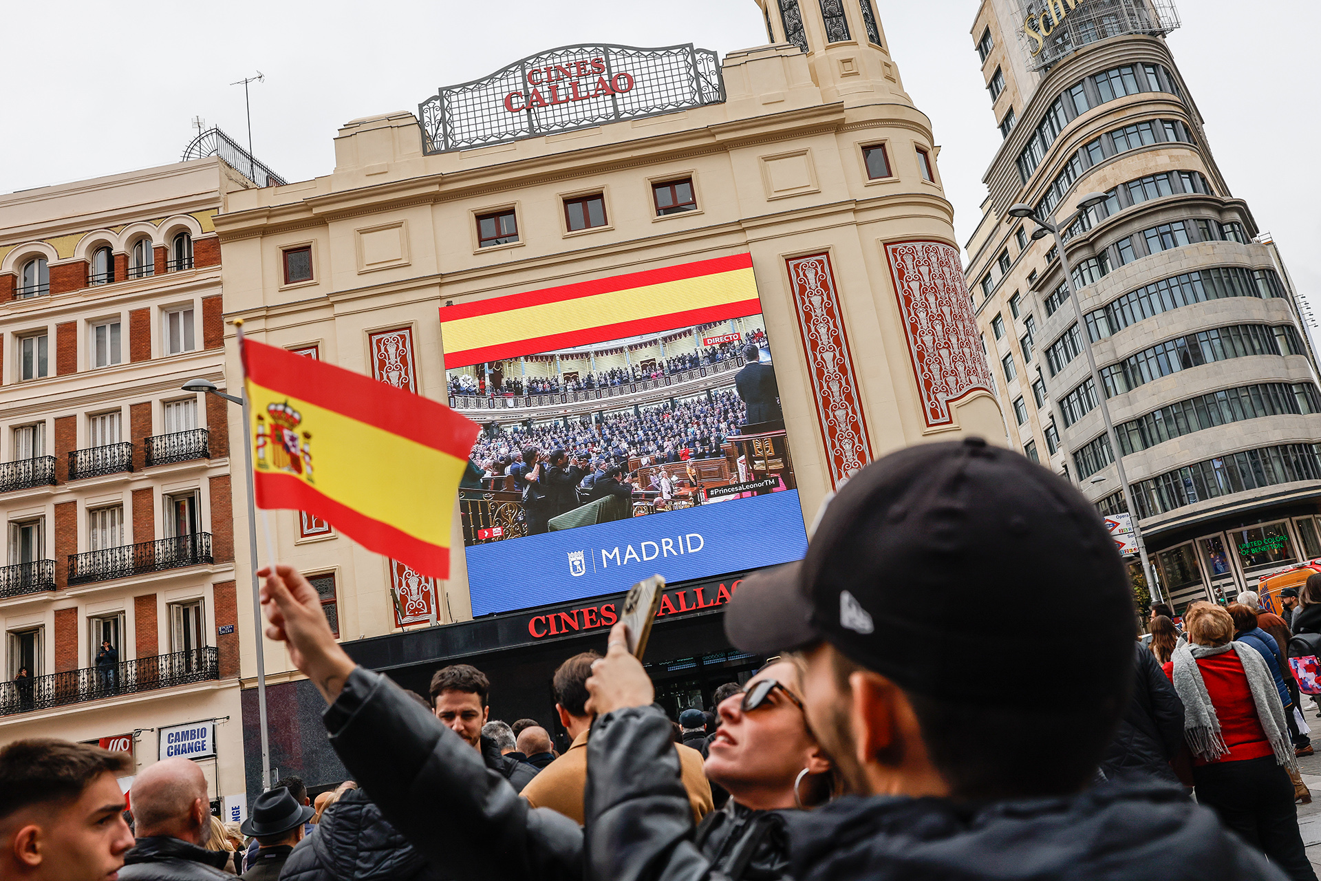 Una multitud sigue la jura en la plaza de Callao, en Madrid.