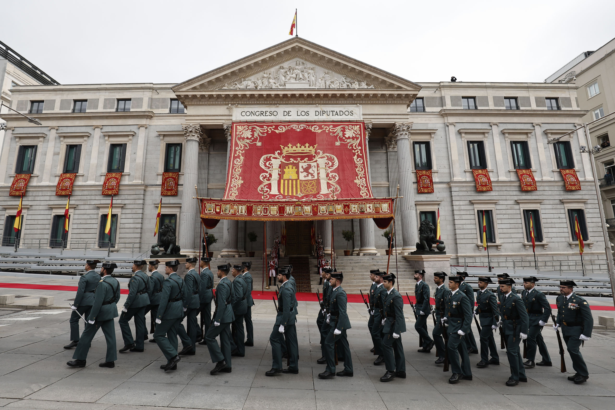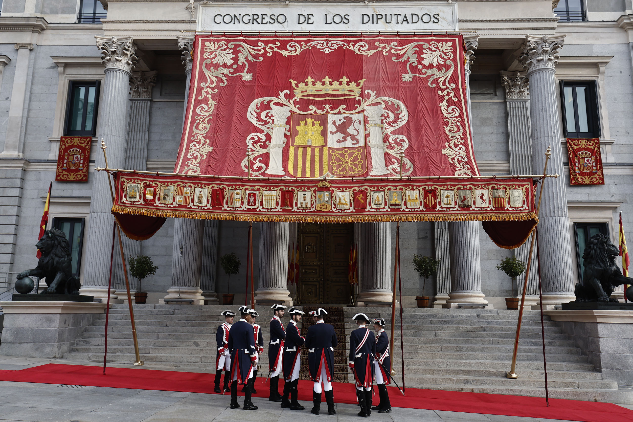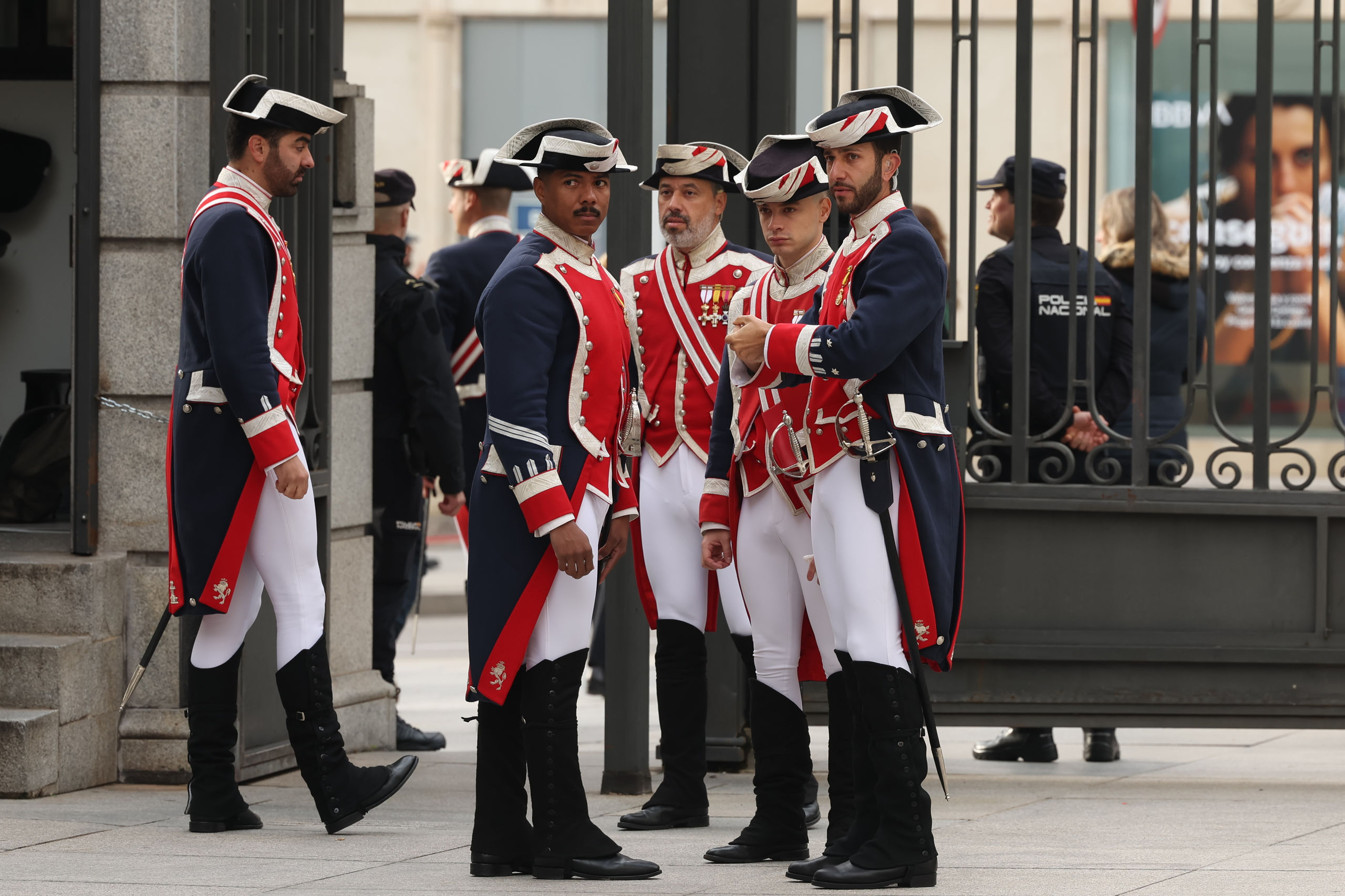 Varios guardias reales conversan a las puertas del Congreso de los Diputados, este martes, ya listo para recibir a Leonor de Borbón que jura la Constitución en el día de su 18 cumpleaños, una ceremonia que representa el hito más importante de su trayectoria institucional y pavimenta el camino para que algún día se convierta en reina.