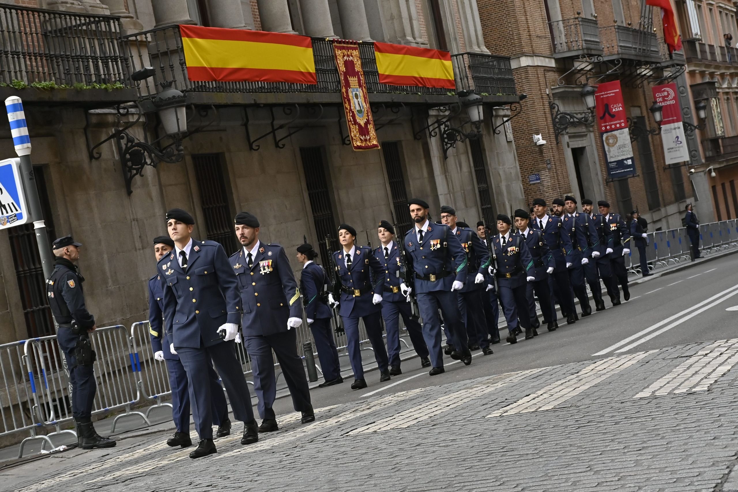 La guardia de honor de la Policía Municipal al paso de la comitiva de la Princesa de Asturias y sigue la ceremonia en las pantallas de Callao.