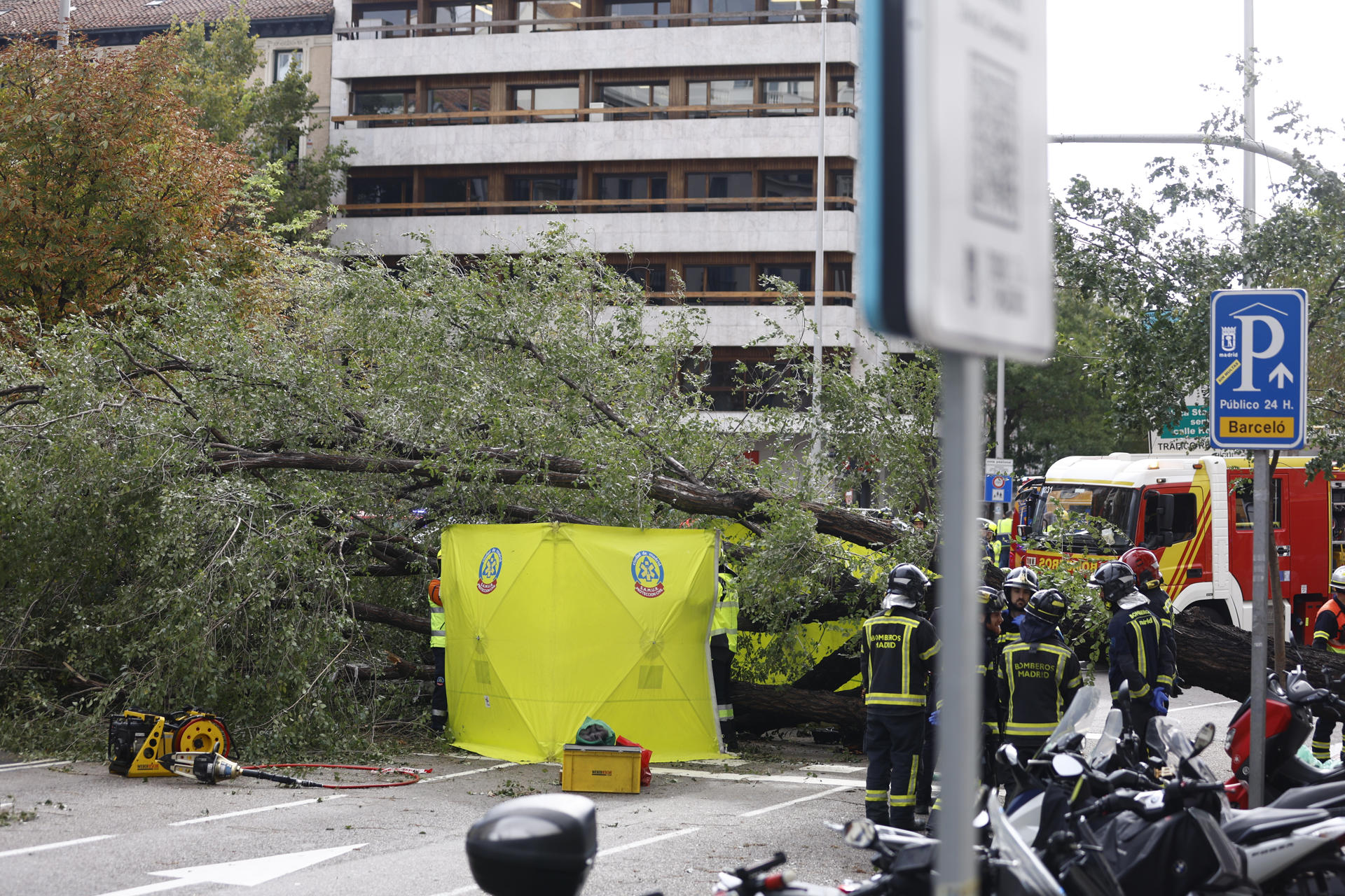 Samur Protección Civil ha confirmado la muerte de una joven de 23 años al caerle encima un árbol a la altura del número dos de la madrileña calle de Almagro. Lo ha hecho por la gravedad de las heridas, sin posibilidad de reanimación. Los servicios de Emergencias se desplazaron al lugar donde atendieron a otros cinco heridos. El psicólogo de guardia ha asistido también a los padres de la fallecida y a una testigo por crisis de ansiedad.