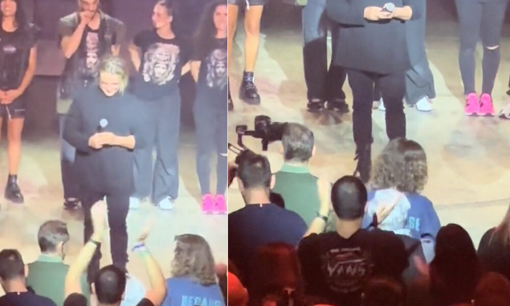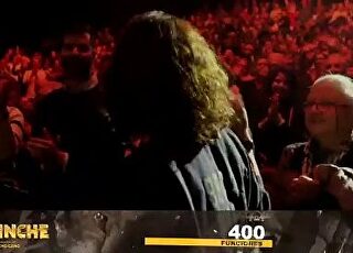 Cuando se enteran de que está en el recinto, el público prorrumpió en aplausos, coreando "¡viva la fruta, viva la fruta!", en referencia a la respuesta que se dio desde la Comunidad de Madrid sobre lo que había dicho Ayuso durante la sesión de investidura de Pedro Sánchez.