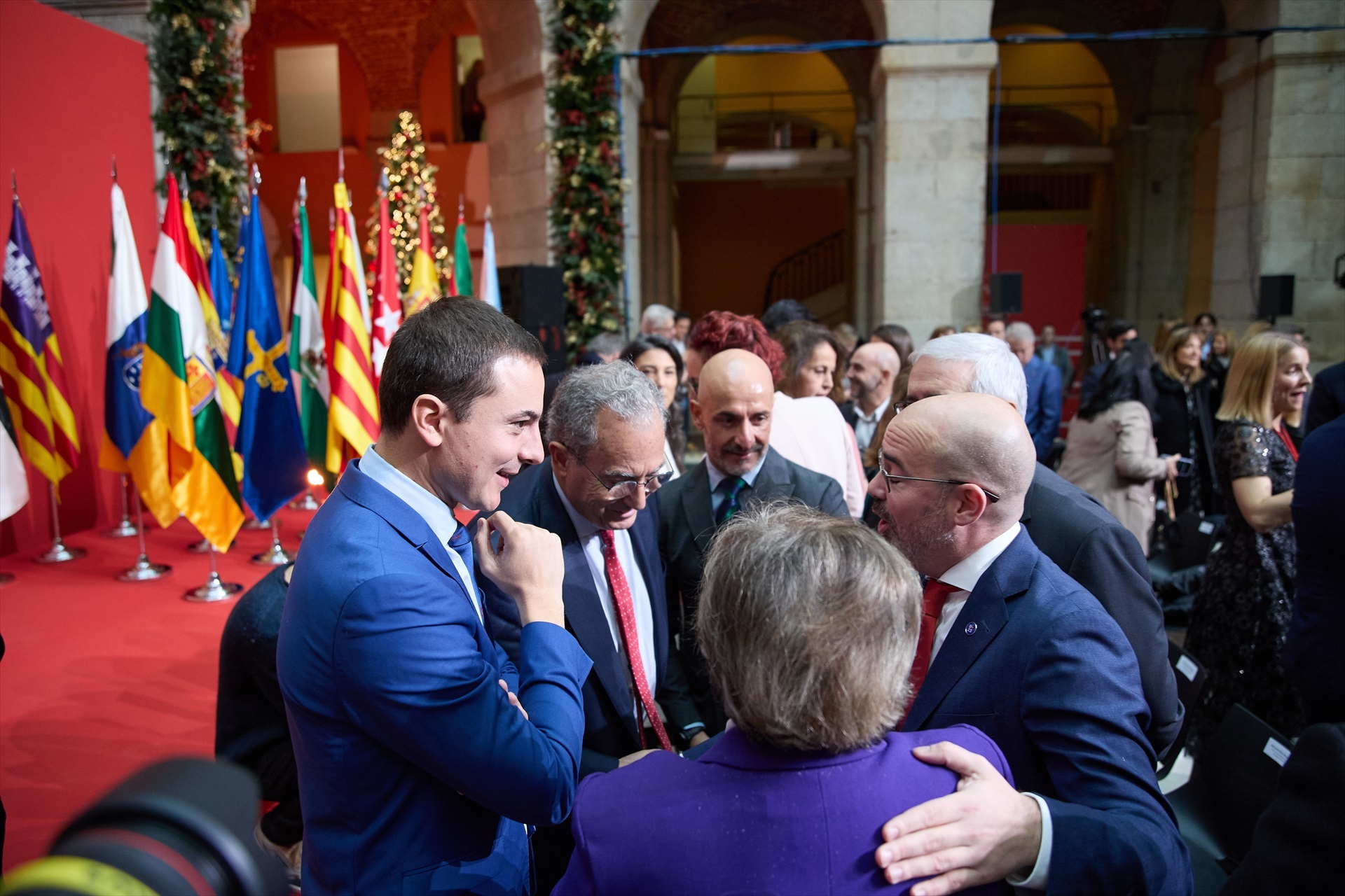 El delegado del Gobierno y el portavoz del PSOE en la Asamblea, Juan Lobato, conversan con más invitados al acto de celebración de la Constitución.