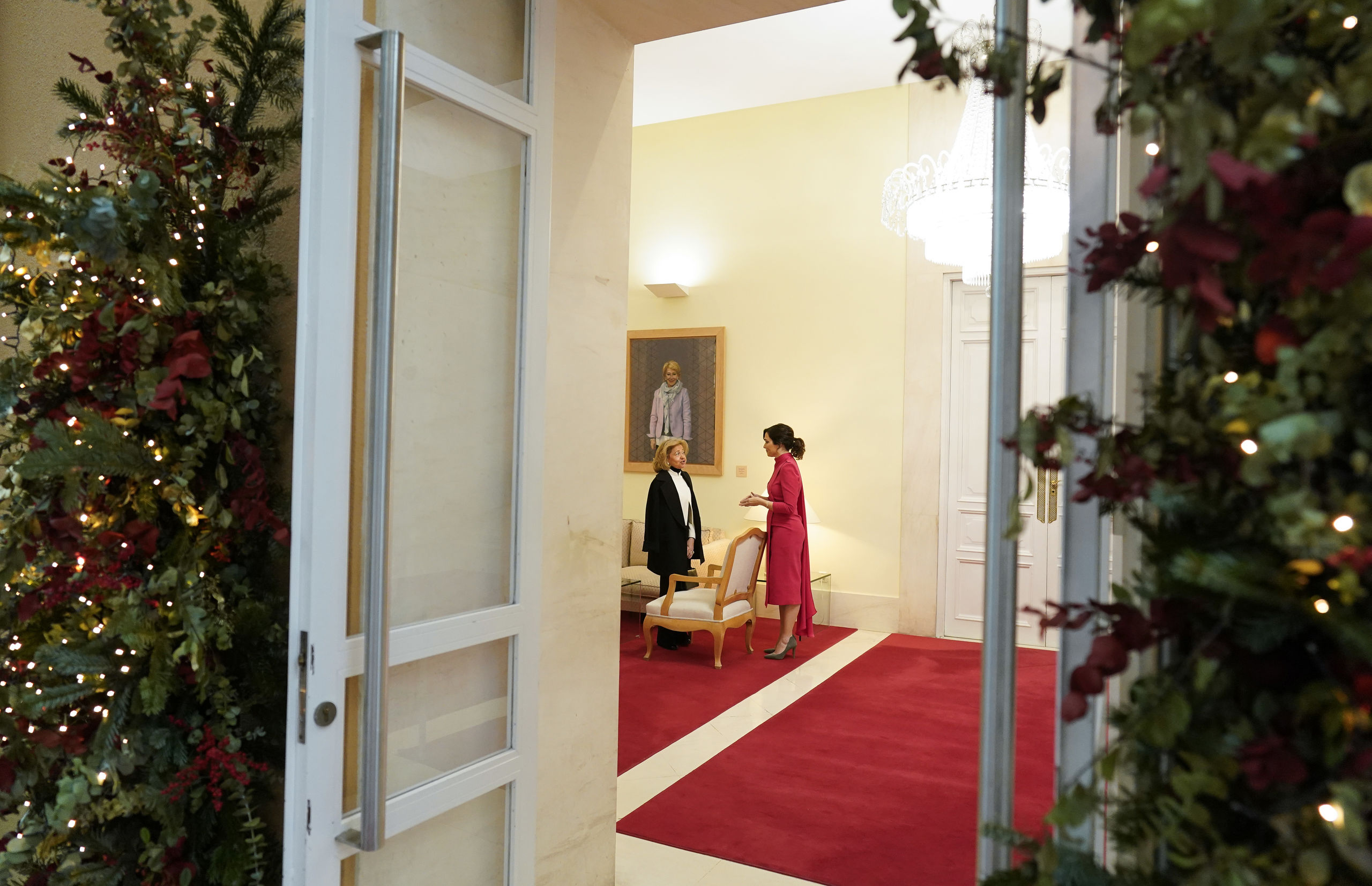 La presidenta de la Comunidad de Madrid, Isabel Díaz Ayuso, junto a la exfiscal general del Estado, Consuelo Madrigal, en una de las salas de la Real Casa de Correos en la Puerta del Sol minutos antes de comenzar el acto.