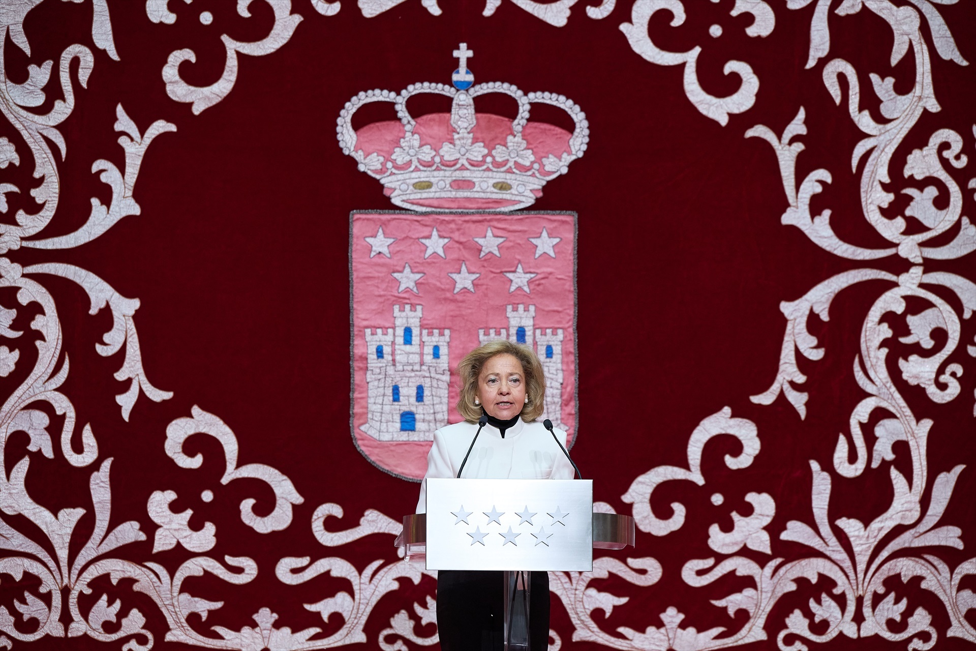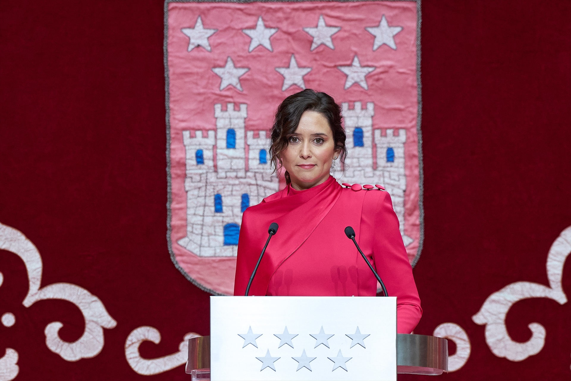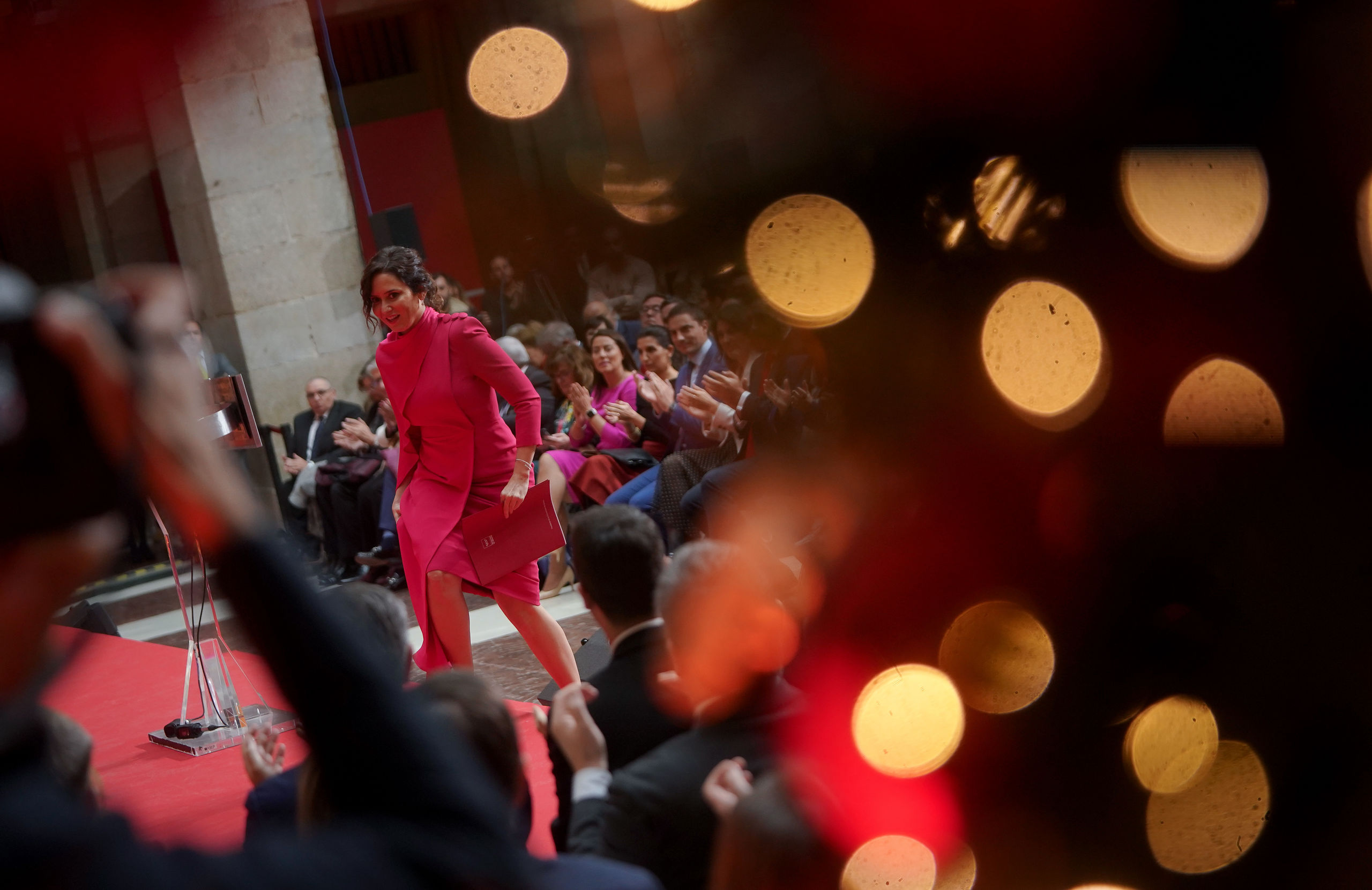 La presidenta madrileña, Isabel Díaz Ayuso, sube al estrado para leer su discurso.