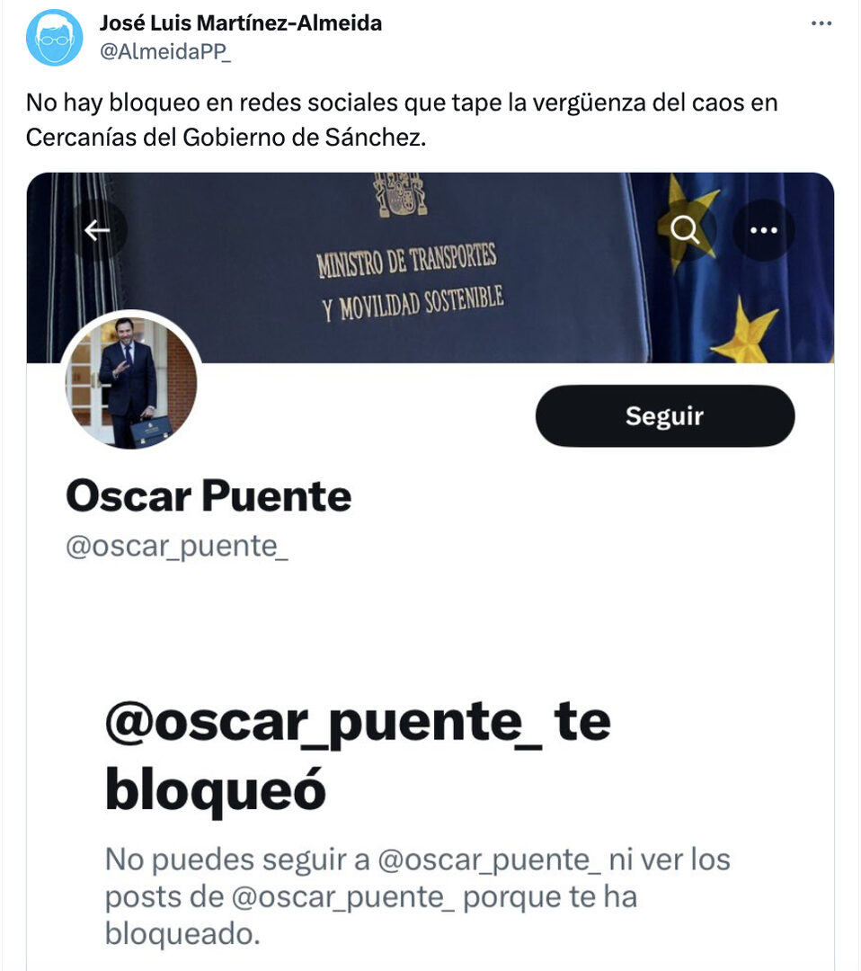 Insólita la reacción del nuevo ministro de Transportes y Movilidad Sostenible, Óscar Puente, que ante las críticas por la situación de Cercanías Madrid, que ha sufrido tres descarrilamientos en 15 días, ha decidido que la mejor solución es bloquear en la red social X a todo aquél que le haya criticado por su inacción.