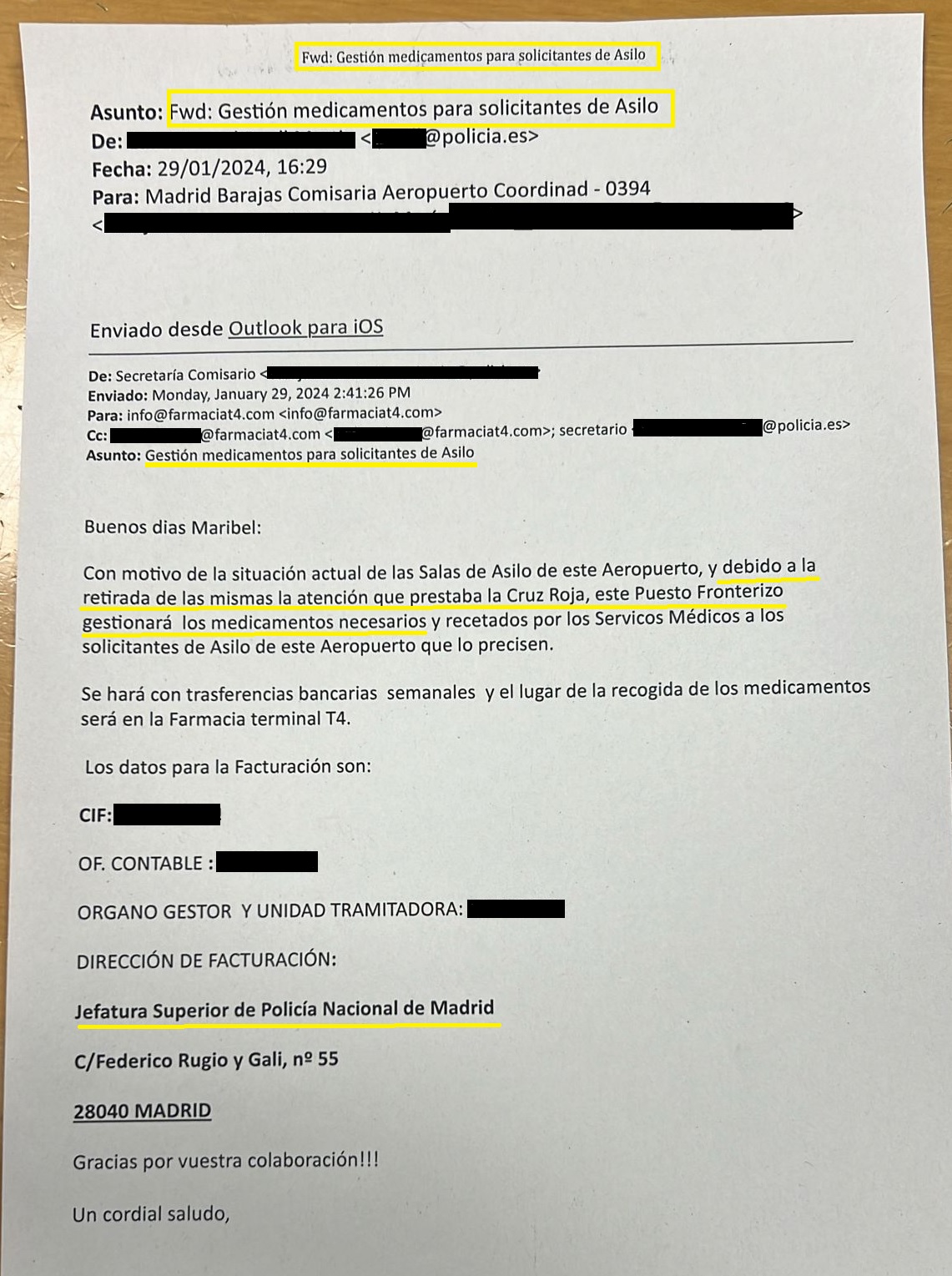 Así queda reflejado en un correo electrónico enviado esta misma semana por la Comisaría de la Policía Nacional en el aeropuerto de Barajas a la farmacia de la Terminal T4 del aeródromo madrileño: "(…) debido a la retirada de la atención que prestaba la Cruz Roja, este Puesto Fronterizo gestionará los medicamentos necesarios y recetados por los Servicios Médicos a los solicitantes de asilo".