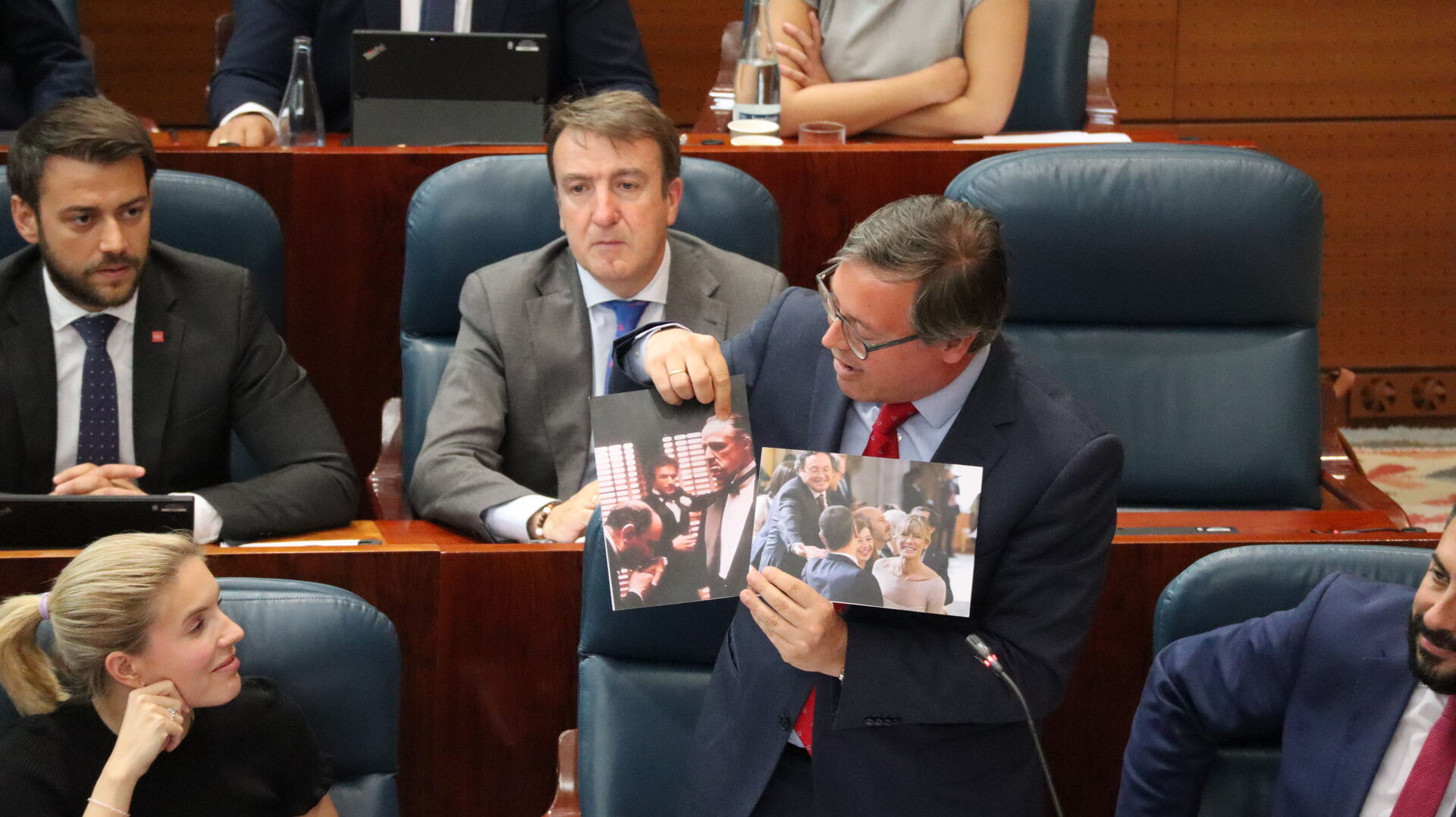 Y haciendo ese paralelismo con El Padrino, el diputado y secretario general del PP de Madrid, Alfonso Serrano, mostró este jueves en la Asamblea dos fotografías: una de la aclamada película y otra que se tomó ayer mismo, durante los actos por el X aniversario de la proclamación de Felipe VI, y que constituye un editorial por sí misma.