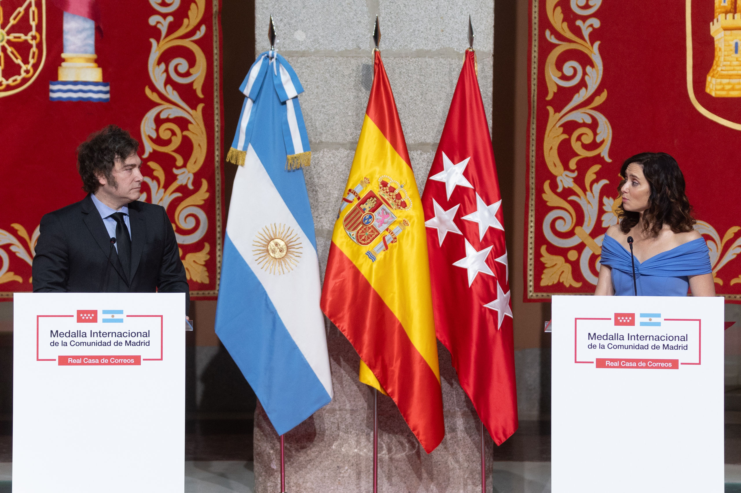 La presidenta de la Comunidad de Madrid, Isabel Díaz Ayuso, ha entregado este viernes al presidente de Argentina, Javier Milei, la Medalla Internacional de la Comunidad, alabando la "firmeza y coraje" con la que está impulsando unas medidas "que suenan a aire fresco" y alertando de "proyectos totalitarios".