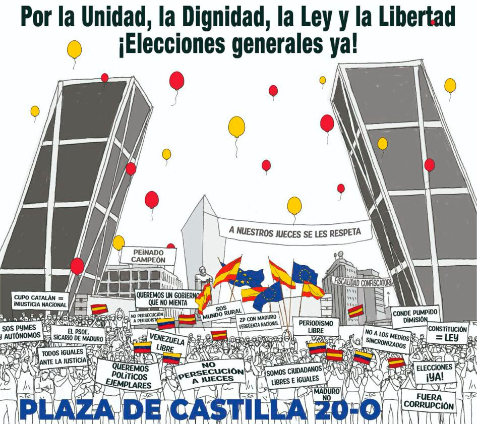 Bajo el lema "Por la unidad, la dignidad, la ley y la libertad: ¡elecciones generales, ya!", la manifestación convocada por la Plataforma por la España Constitucional en contra del gobierno de Pedro Sánchez este domingo, 20 de octubre pretende hacer un llamamiento a la convocatoria anticipada de elecciones, denunciando una larga lista de "actuaciones, demasiado graves y evidentes".