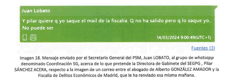 Al día siguiente, ya cuando Sánchez Acera le remite el email del abogado del novio de la presidenta, Lobato comunica en el chat que comparte con David del Campo y Marta Bernardo lo siguiente: "Y Pilar quiere que yo saque el mail de la Fiscalía. Que no ha salido (en los medios) pero que lo saque yo… No puede ser". Esto llama la atención de los agentes de la UCO: "Llama la atención que mencione directamente a Fiscalía y no a cualquier otro potencial interviniente o utilizase una terminología más ambigua".