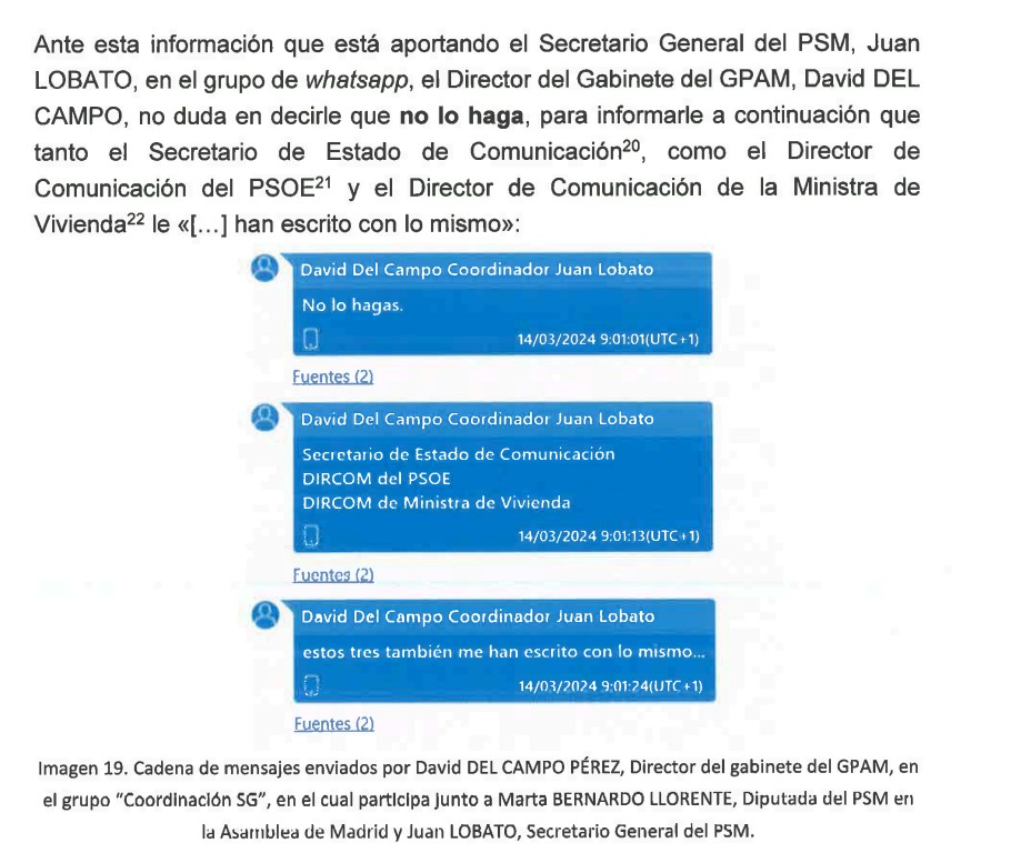 La UCO reproduce ese mensaje de Lobato: "A ver, un tema. Me llama Santos. Pedro va a pedir ahora a Feijóo que dimita Ayuso. Y que lo pidamos nosotros también". El informe prosigue indicando que el día siguiente Del Campo envía a Lobato un nuevo mensaje que clarifica "las intenciones existentes desde otros estamentos de su propio partido político", dándole a entender a Lobato "que debe mantenerse al margen de esos propósitos".