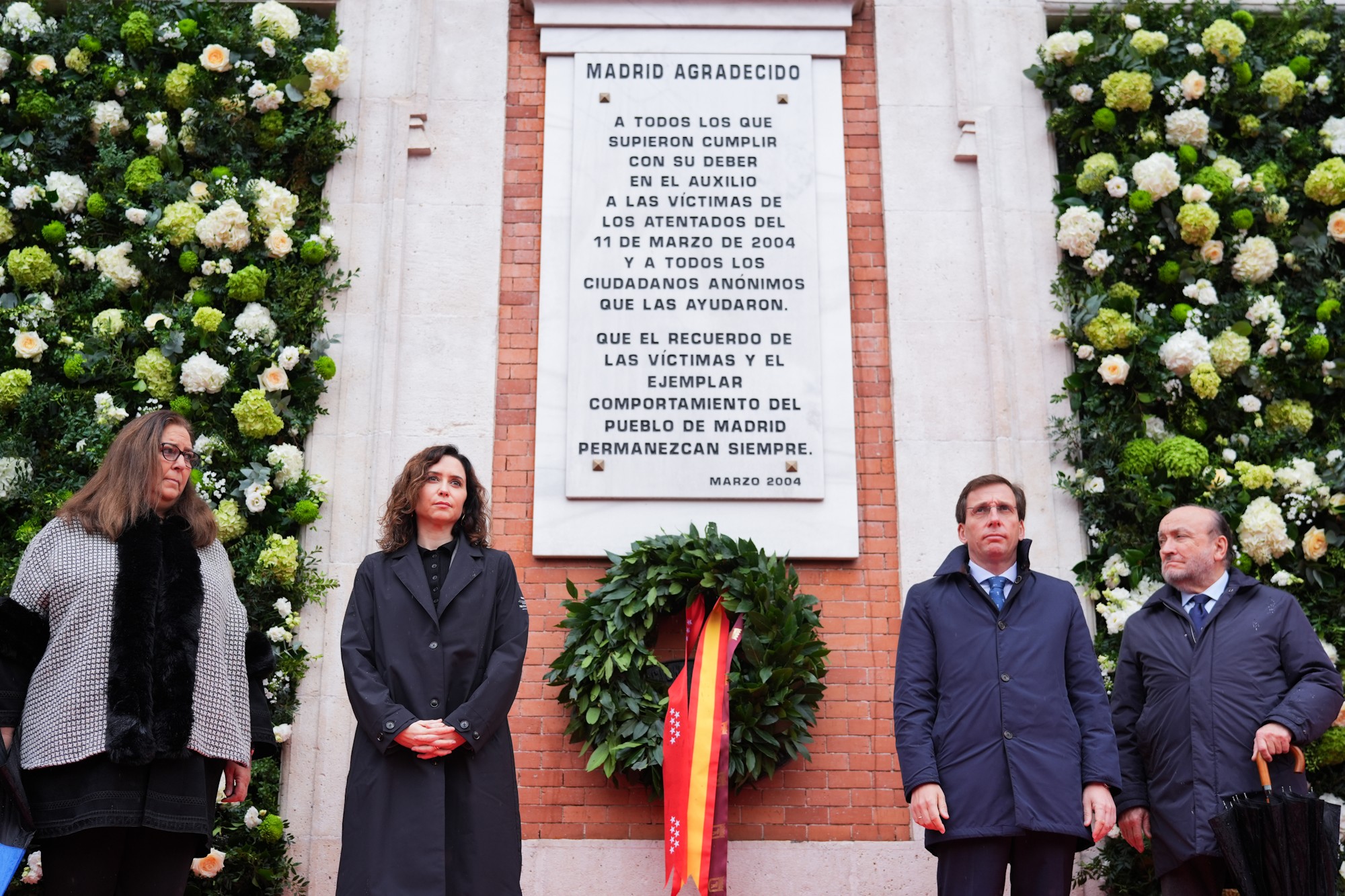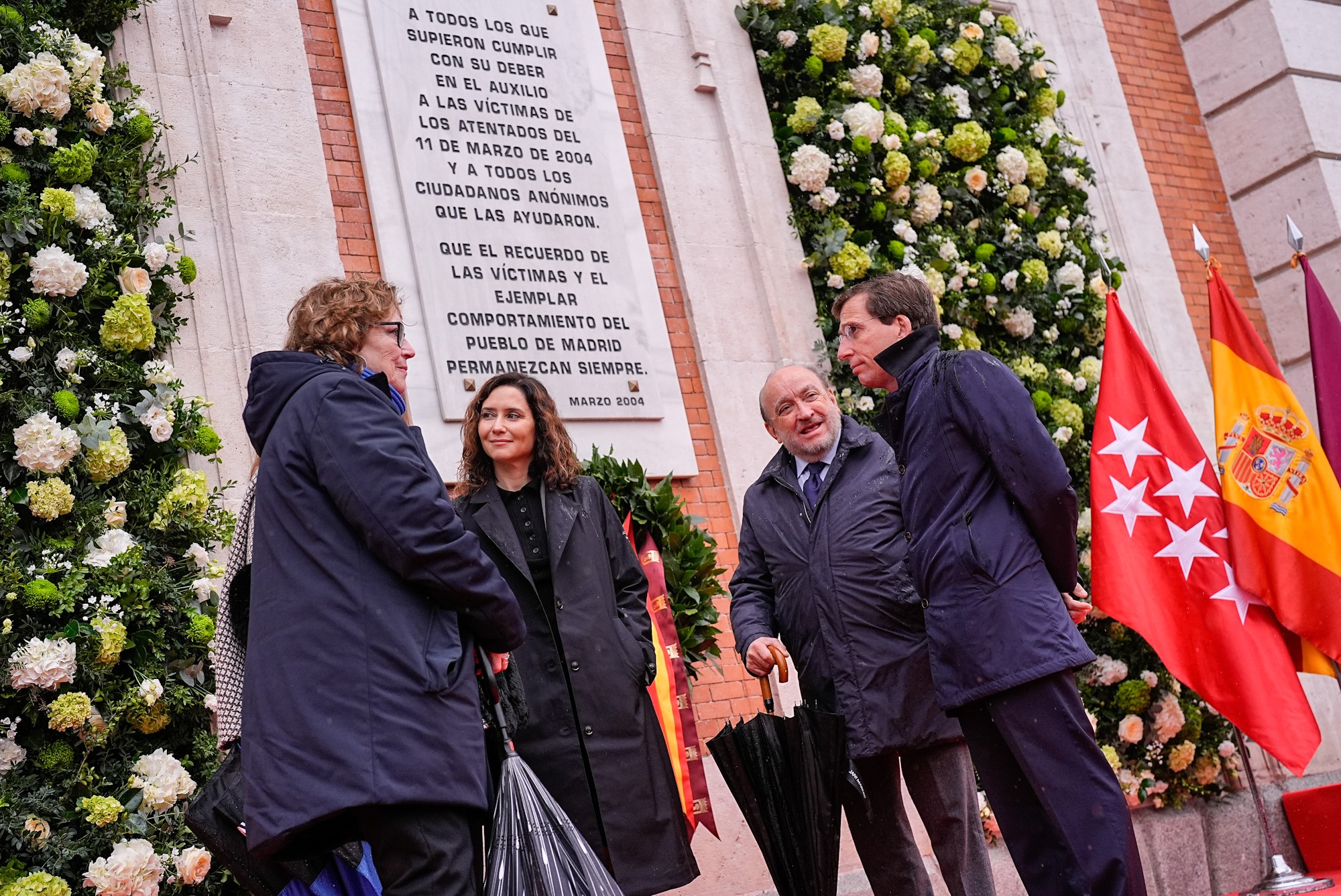 Ayuso y Almeida han colocado una corona de flores bajo la placa de la fachada de la Real Casa de Correos que recuerda a las víctimas del atentado, acompañados de los presidentes de la Asociación Víctimas del Terrorismo, Maite Araluce; de la Fundación Víctimas del Terrorismo, Juan Francisco Benito; y de la Asociación 11M Afectados del Terrorismo, Monserrat Soler.
