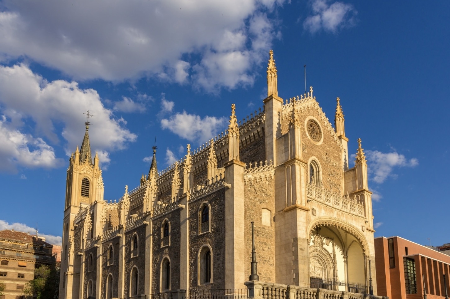 La Iglesia de San Jerónimo el Real, conocida como Los Jerónimos, es considerada la catedral no oficial de Madrid por su historia, belleza y popularidad. Originalmente construida por Isabel la Católica, fue sede de las juras de los herederos a la corona. Aunque es uno de los pocos ejemplos de gótico tardío en la ciudad, su arquitectura mezcla varios estilos debido a las reformas a lo largo de los siglos, como la escalinata construida para la boda de Alfonso XIII en 1906 y la integración del claustro al Museo del Prado en 2007, diseñada por Rafael Moneo.
