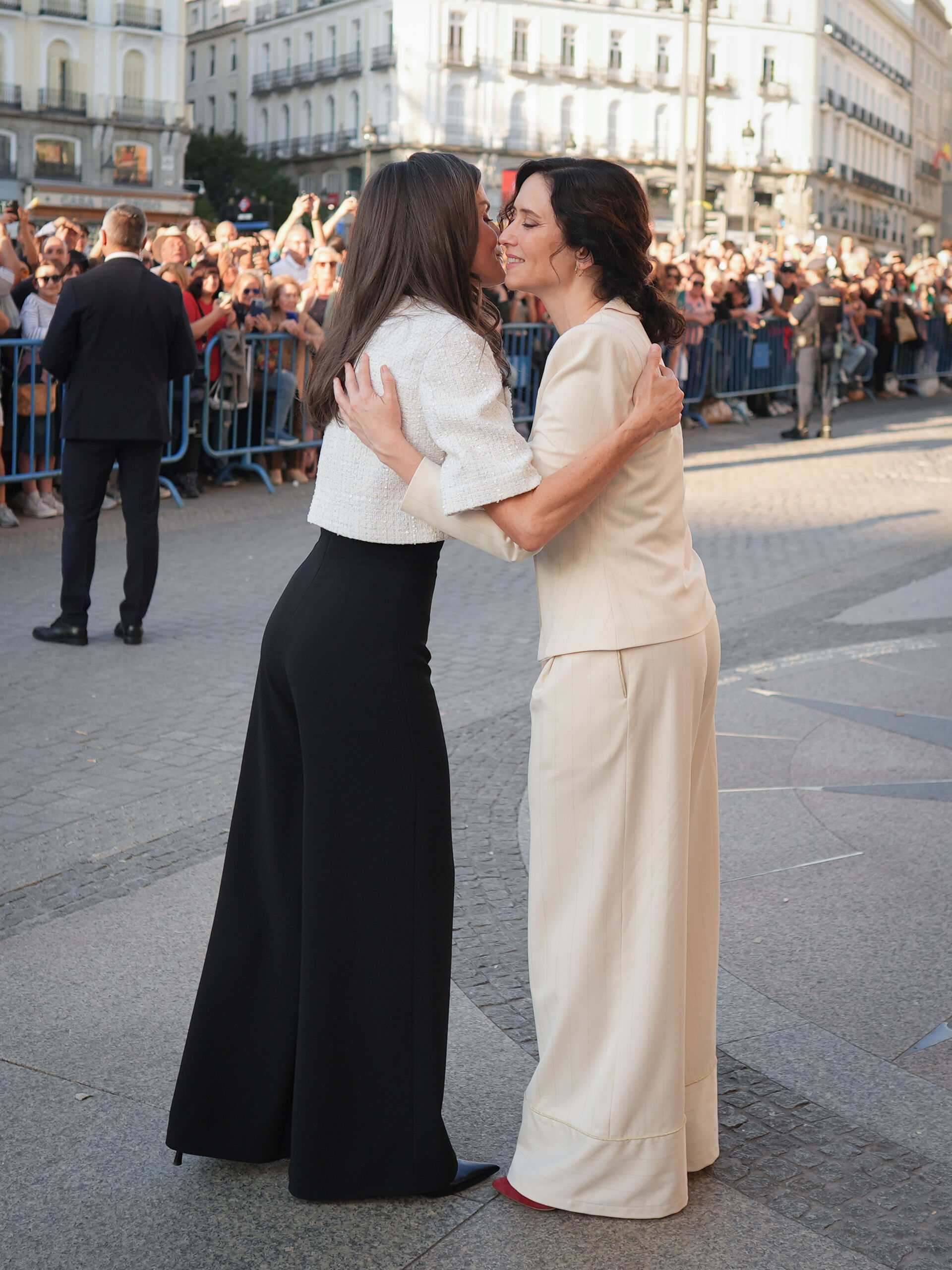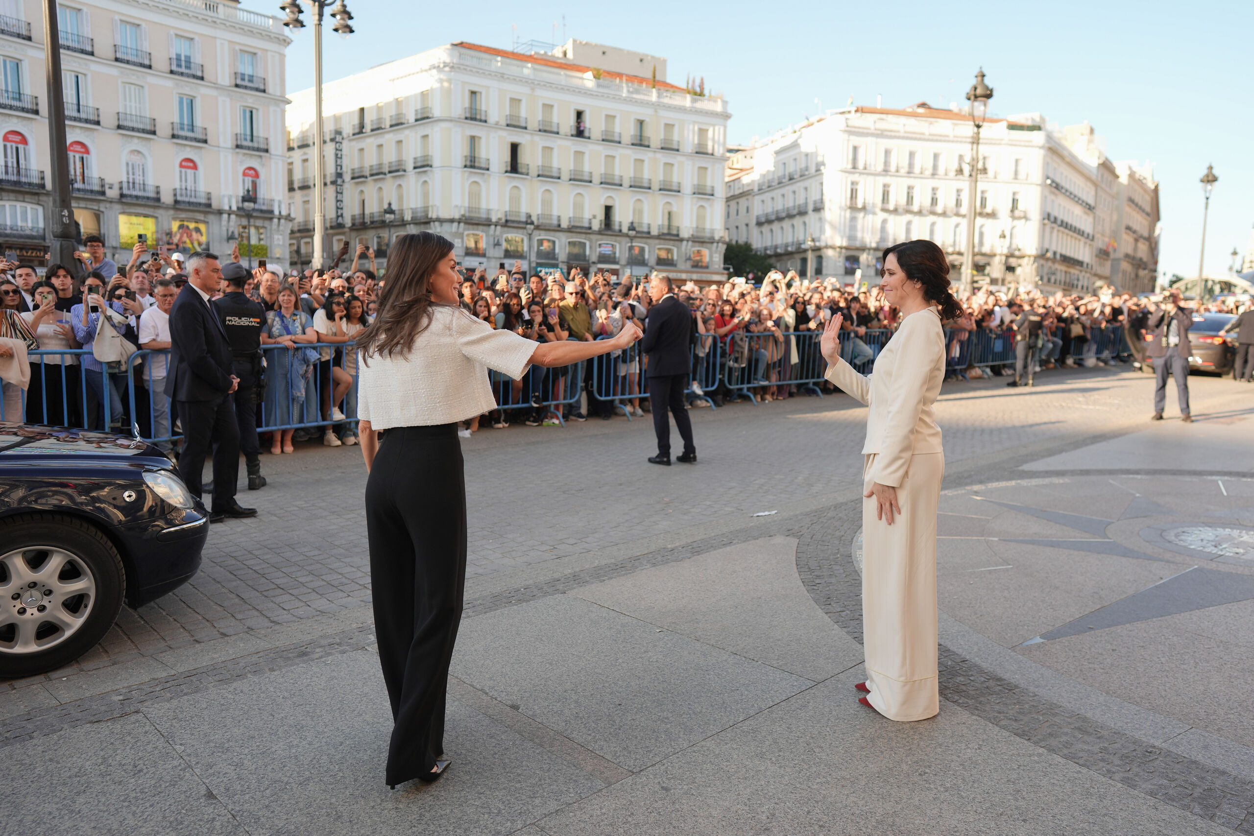 La presidenta de la Comunidad de Madrid, Isabel Díaz Ayuso, y la Reina Doña Letizia, se han saludado en la Puerta del Sol, frente a la Real Casa de Correos, escenario de la 47ª edición de los Premios El Barco de Vapor y Gran Angular.