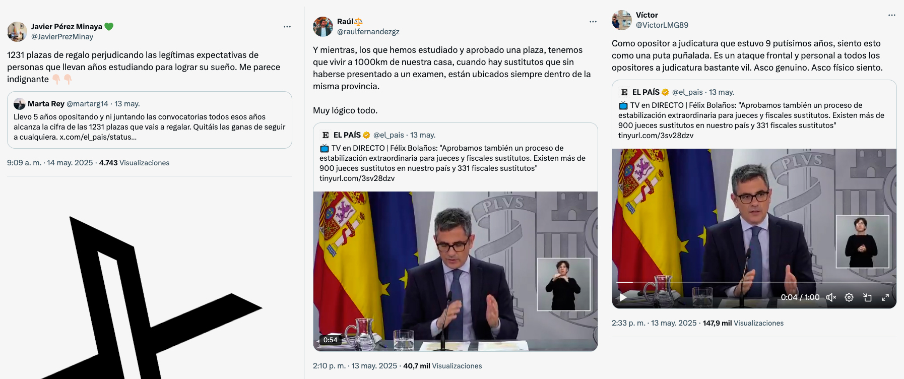 De hecho, decenas de opositores mostraron su desolación a través de redes sociales cuando el ministro Bolaños anunció que se aprobaba un "proceso de estabilización extraordinaria para jueces y fiscales sustitutos". "Llevo cinco años opositando y ni juntando las convocatorias de todos esos años alcanza la cifra de las 1.231 plazas que vais a regalar. Quitáis las ganas de seguir a cualquiera". "Como opositor, que estuvo nueve putísimos años, siento esto como una puñalada. Es un ataque frontal y personal a todos los opositores a judicatura bastante vil. Asco genuino. Asco físico siento".