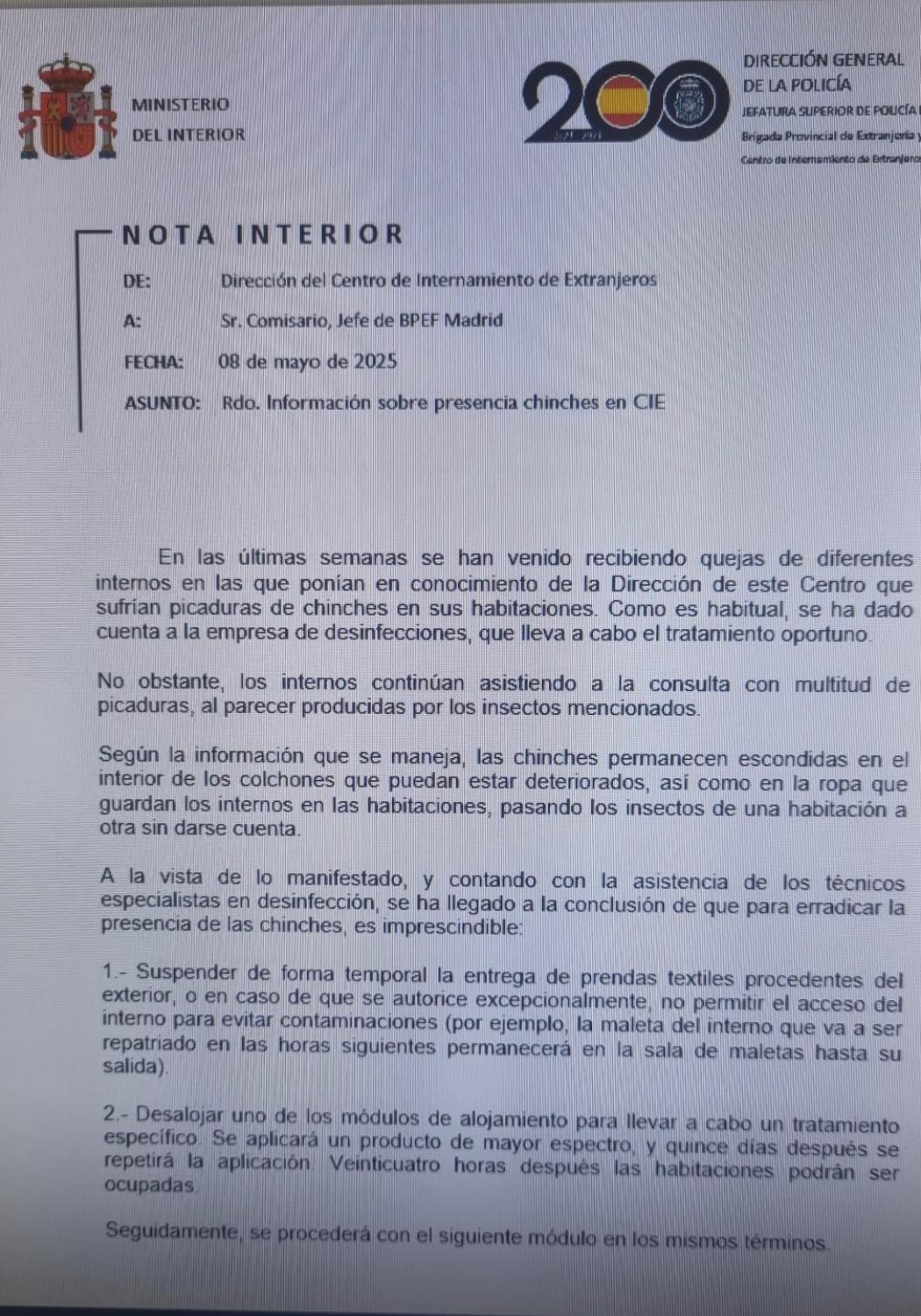 "No obstante", prosigue la nota, "los internos continúan asistiendo a la consulta con multitud de picaduras, al parecer producidas por los insectos mencionados. Según la información que se maneja, las chinches permanecen escondidas en el interior de los colchones que puedan estar deteriorados, así como en la ropa que guardan los internos en las habitaciones, pasando los insectos de una habitación a otra sin darse cuenta", explica la nota oficial que acompaña el sello del Ministerio del Interior de Fernando Grande-Marlaska.