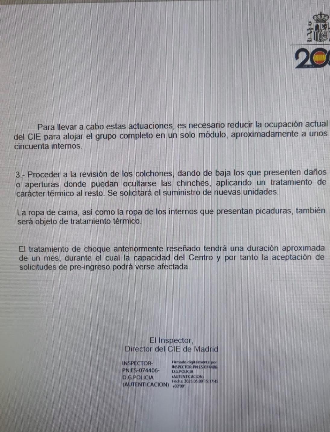 "A la vista de lo manifestado, y contando con la asistencia de los técnicos especialistas en desinfección, se ha llegado a la conclusión de que para erradicar la presencia de las chinches, es imprescindible", apunta el mensaje interno: "Suspender de forma temporal la entrega de prendas textiles procedentes del exterior, o en caso de que se autorice excepcionalmente, no permitir el acceso del interno para evitar contaminaciones (por ejemplo, la maleta del interno que va a ser repatriado en las horas siguientes permanecerá en la sala de maletas hasta su salida)".