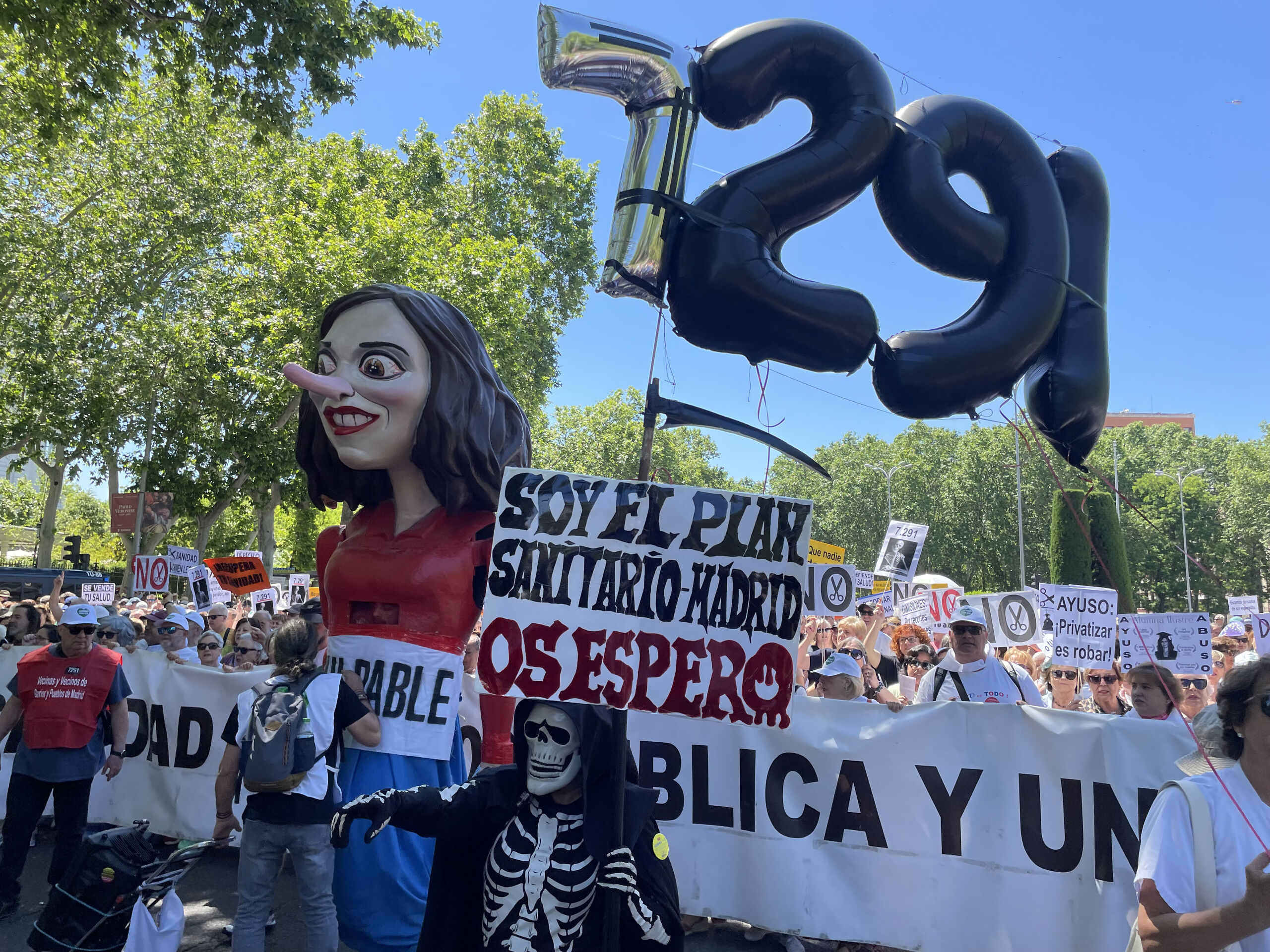 La encabeza, la lidera, al tiempo que es señalada por todos. Así ha propuesto la izquierda su particular linchamiento contra la presidenta madrileña, a la que le recriminan la "privatización" de la Sanidad Pública madrileña, que ofrece el horario más amplio del país (de 8 a 21h) y es la comunidad que más citas médicas genera al día con una cifra de 3.600, según informa la doctora Ana Hernández. "Oé oé oé oá, a la Pinocha le queremos preguntar, cuántos negocios ha montado ya con el dinero de la Sanidad", cantaban los manifestantes, paradójicamente a su paso por el Ministerio de Sanidad de Mónica García, a quien no le ha caído ningún reproche pese a no haber presentado ninguna propuesta de reforma del sistema de financiación sanitaria ni haber aprobado —como prometió con fecha límite diciembre de 2024— el estatuto marco de los sanitarios.