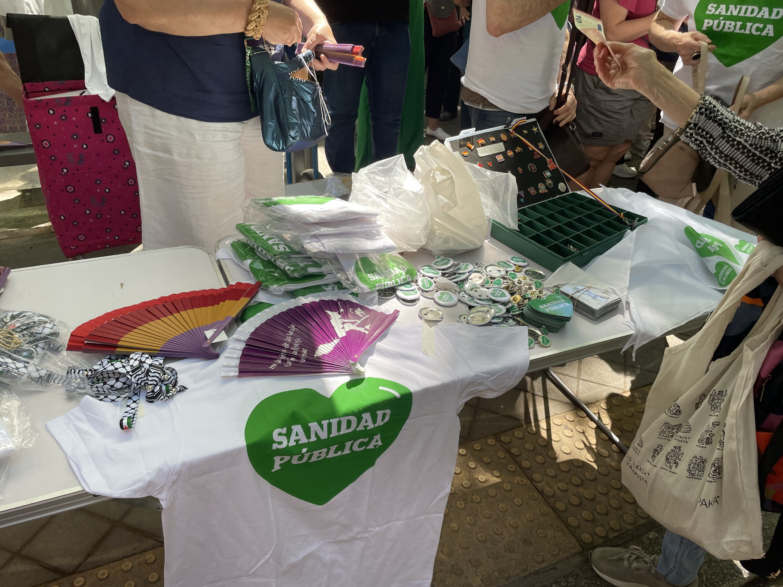 Dos mujeres venden 'merchandising' de la manifestación a favor de la Sanidad Pública. A su llegada al Ayuntamiento, los organizadores han destacado que todavía se pueden hacer donaciones al más del centenar de asociaciones que han convocado la manifestación: "Os recordamos que hay voluntarios con petos rojos recaudando dinero porque las manifestaciones no son gratis y tenemos que seguir en la lucha".