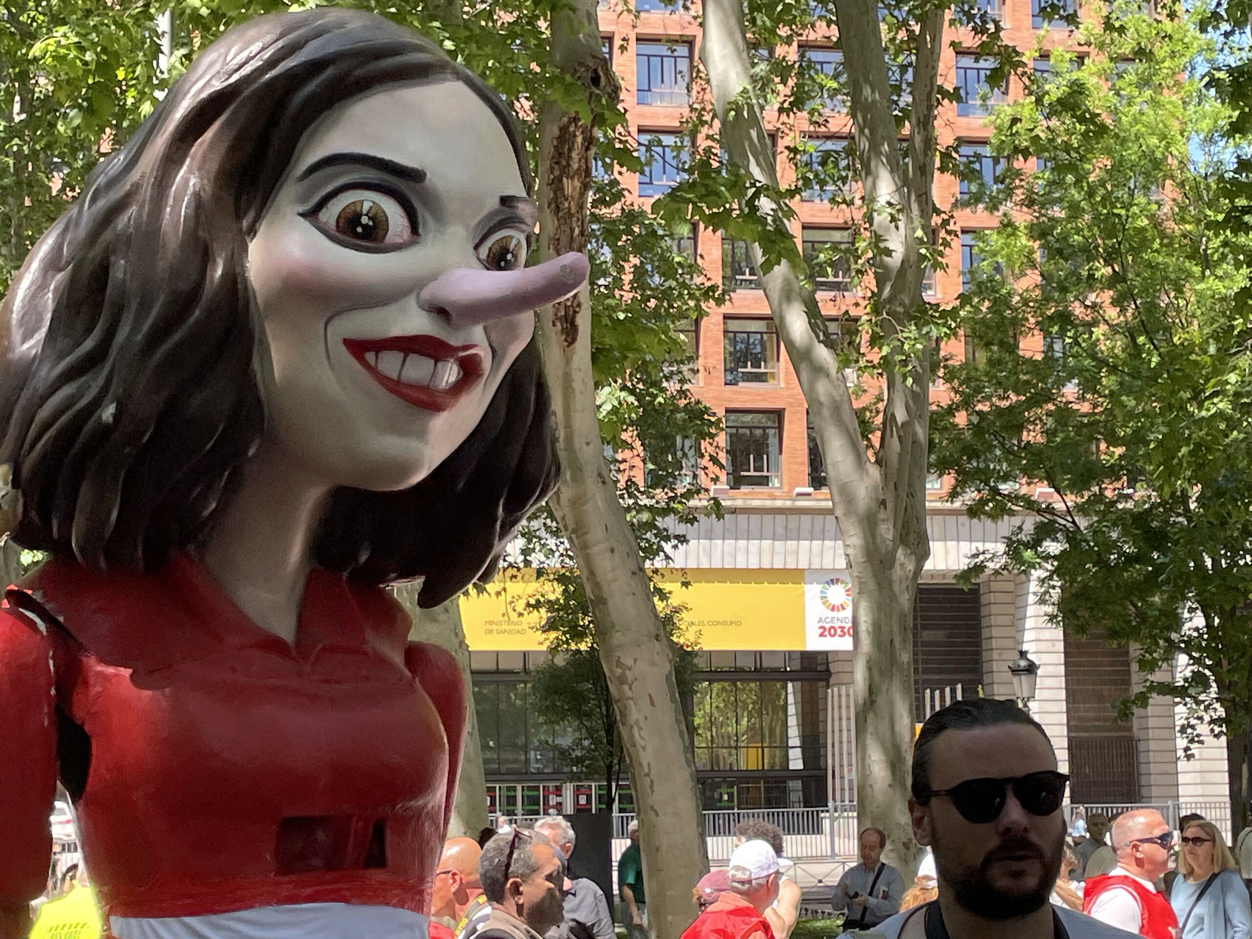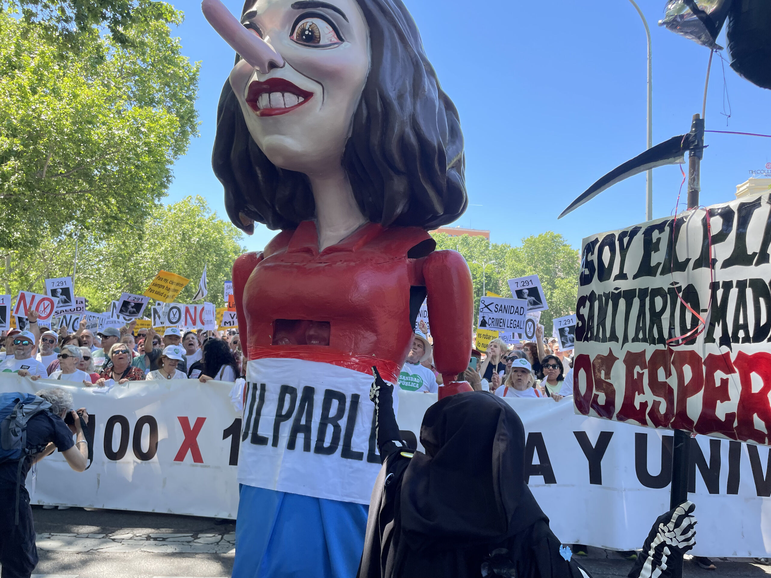 Los manifestantes gritan “culpable" al muñeco de madera bautizacomo como “Pinocha" que representa a la presidenta de la Comunidad de Madrid. Una persona vestida de muerte porta un cartel en el que se puede leer “soy el plan sanitario de Madrid; os espero" y unos globos con el número 7.291, que representa a los fallecidos en las residencias madrileñas durante la pandemia que la izquierda achaca a la gestión de Ayuso.