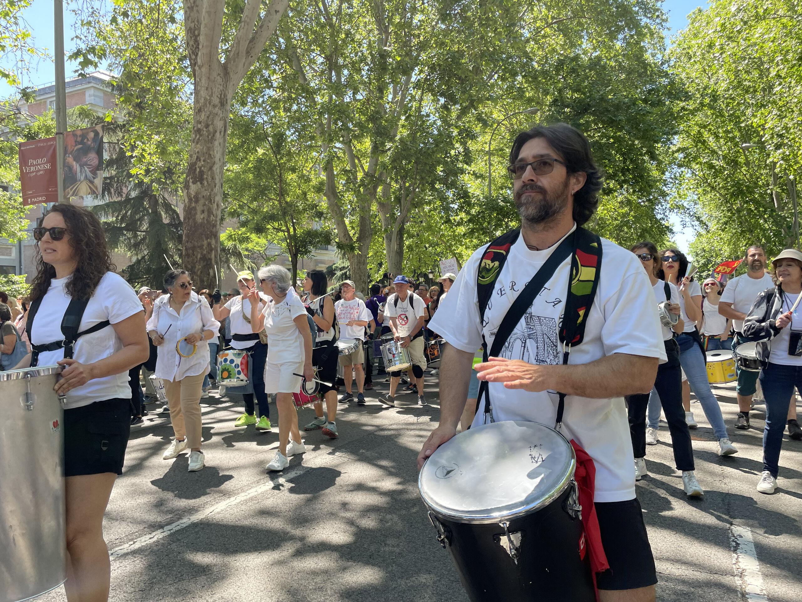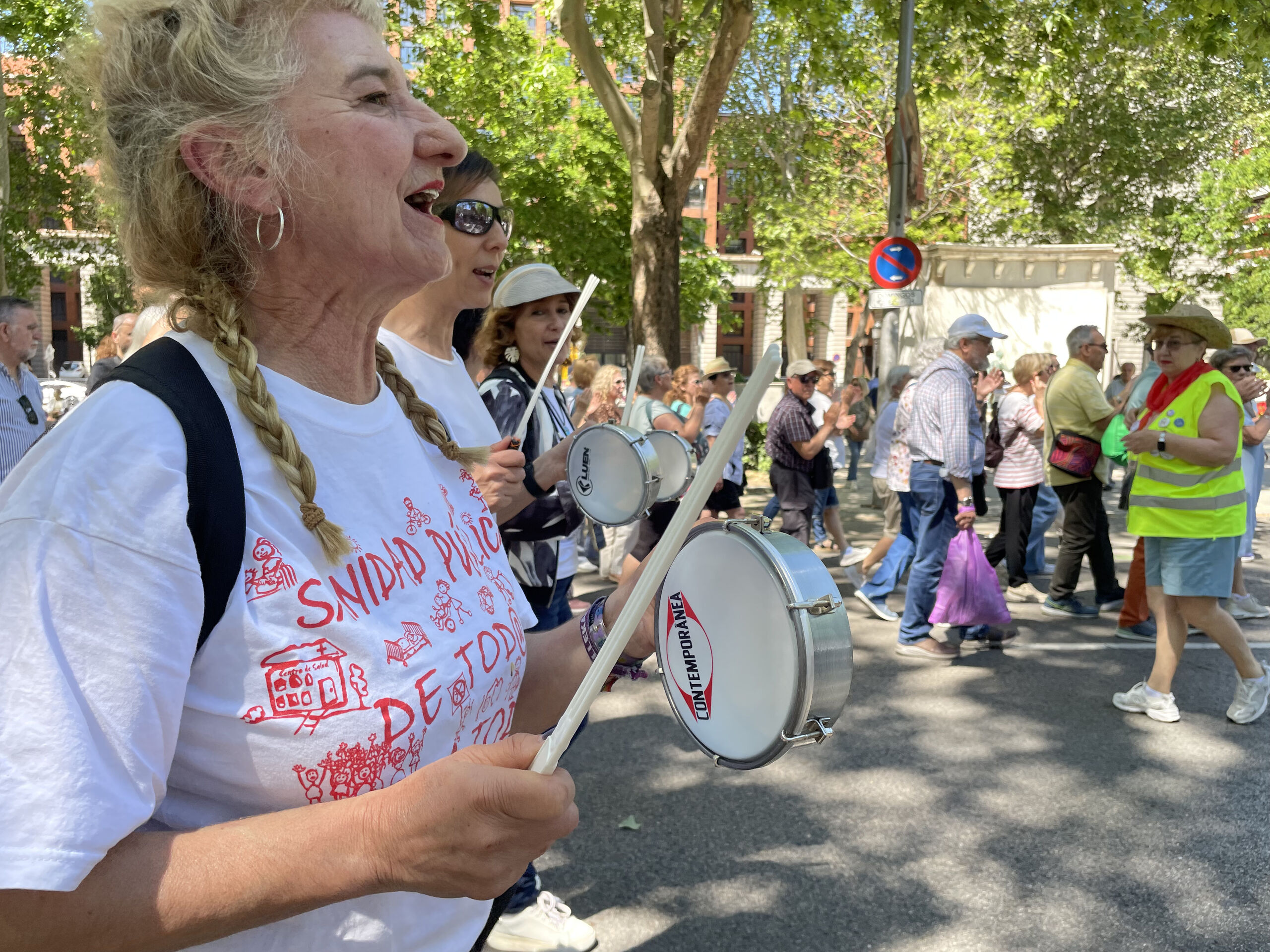 Un grupo de personas con instrumentos de percusión anima la manifestación por los 7.291 fallecidos en las residencias de mayores durante la pandemia.