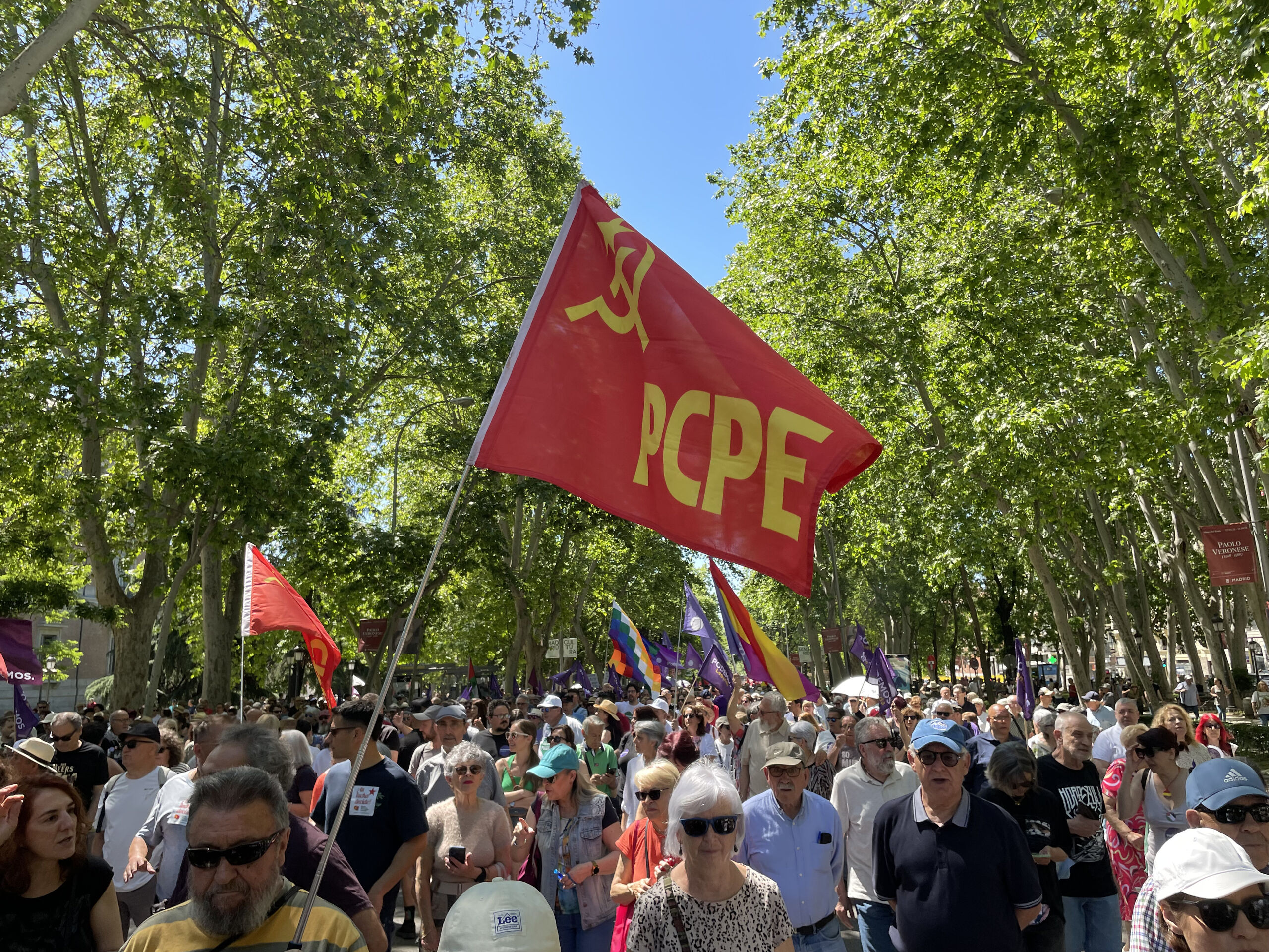 Un hombre porta la bandera del Partido Comunista de los Pueblos de España en la concentración.