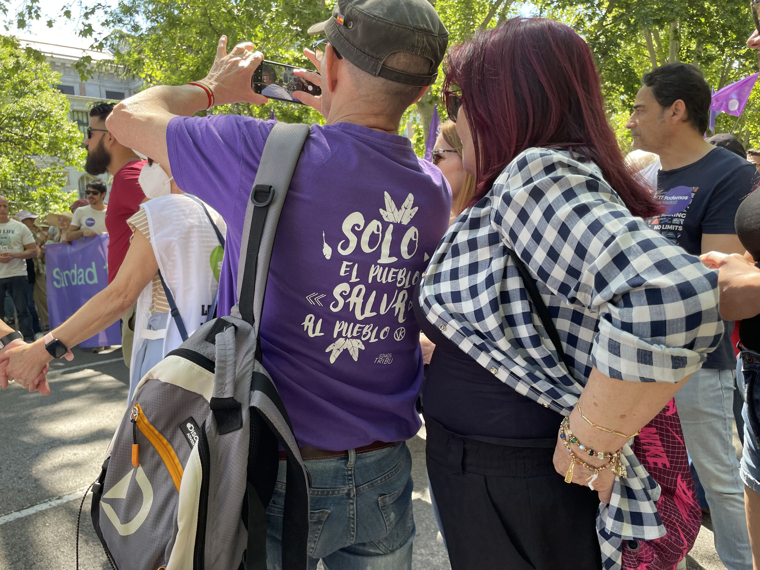 Un manifestante lleva una camiseta morada con el lema: "Solo el pueblo salva al pueblo".