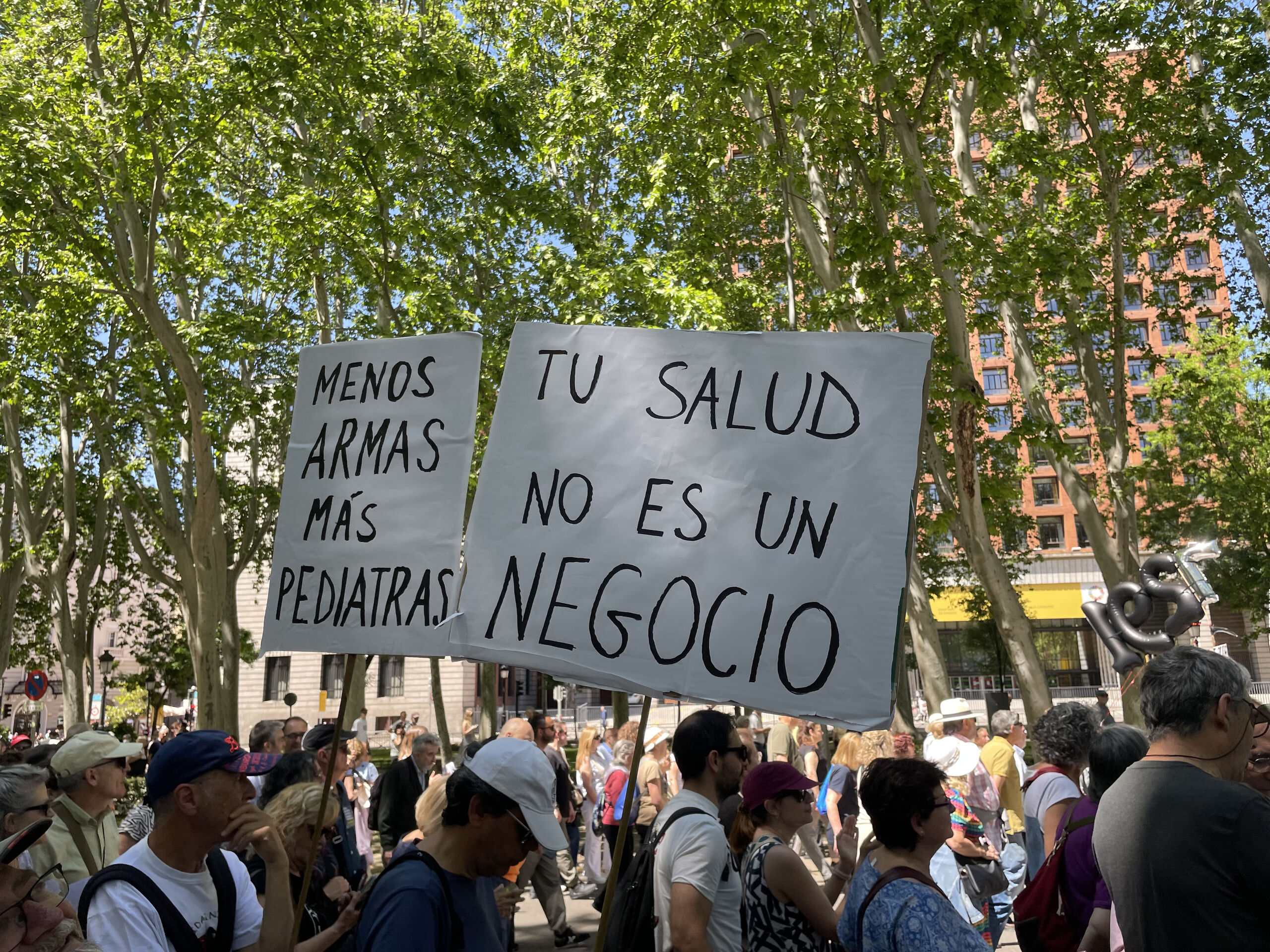 “Tu salud no es un negocio", asegura un cartel que es acompañado por otro que pide “menos armas".