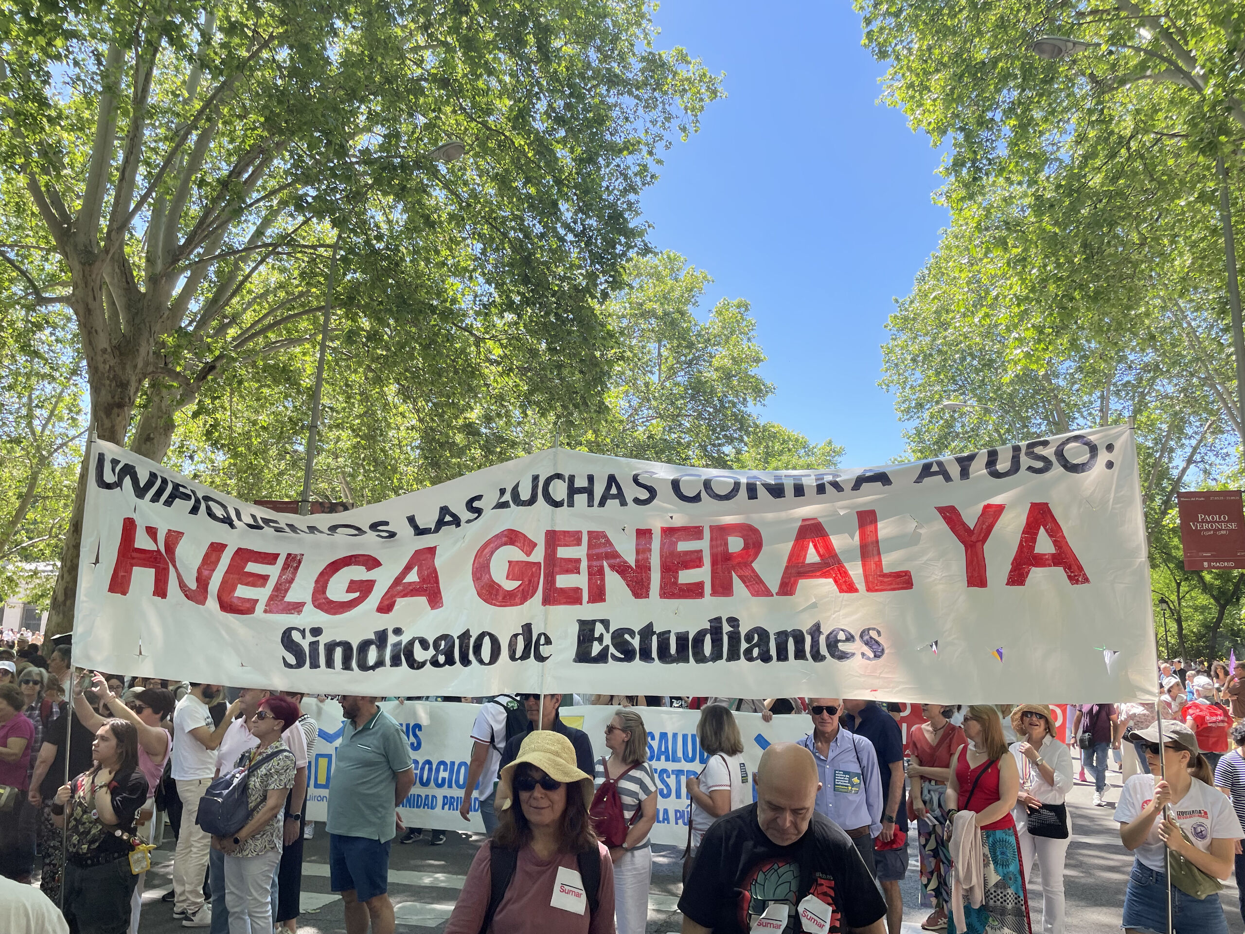 Una pancarta pide una huelga general, es decir, de todo el país para protestar contra la gestión de Ayuso de la Sanidad Pública madrileña. “Unifiquemos la lucha contra Ayuso", pide el Sindicatos de Estudiantes.