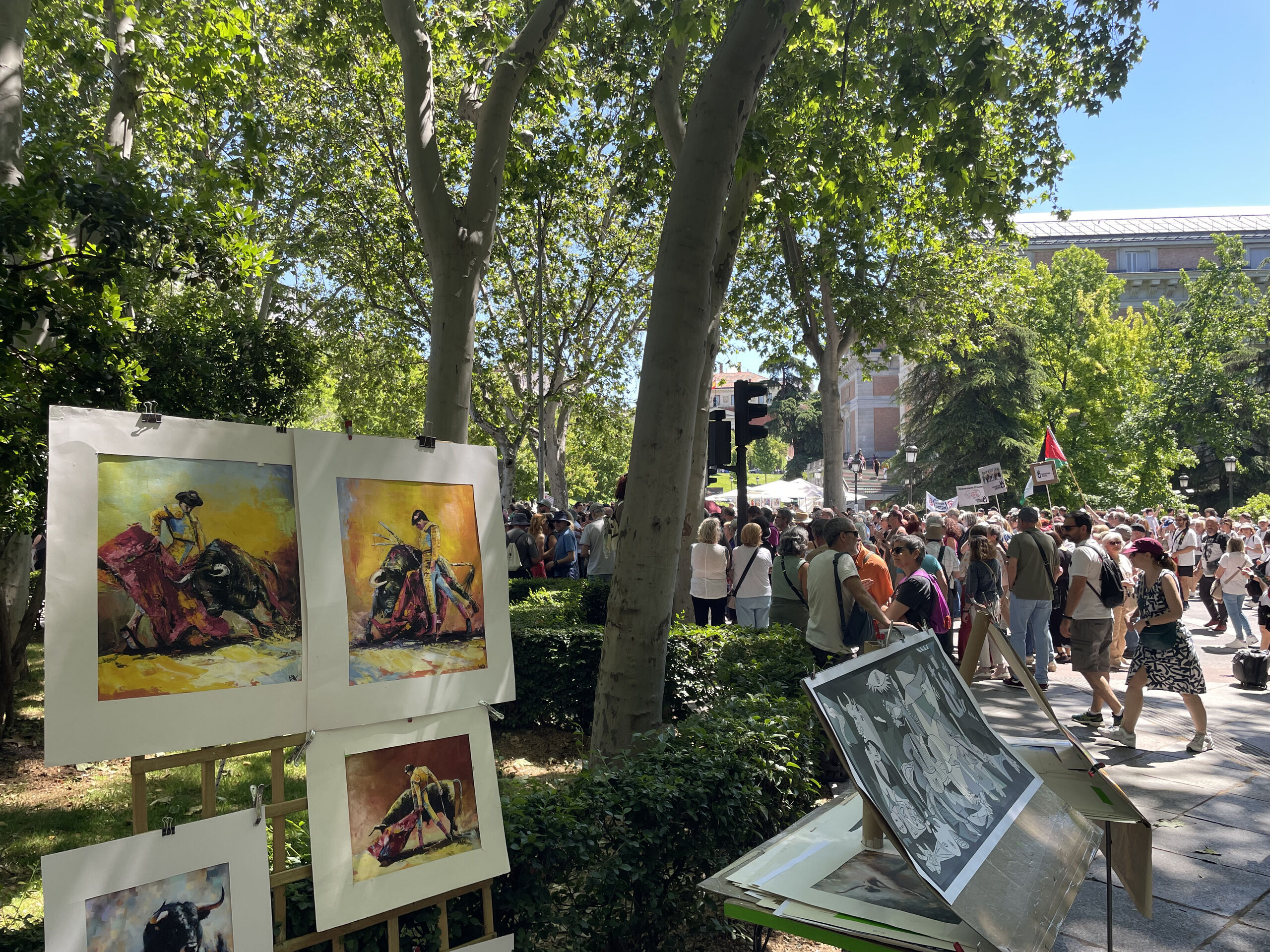 Durante la manifestación se ha coreado “menos toreros y más enfermeros". Hecho que ha coincidido con el paso de la concentración por el puesto de un artista callejero, que exponía pinturas sobre la tauromaquia.