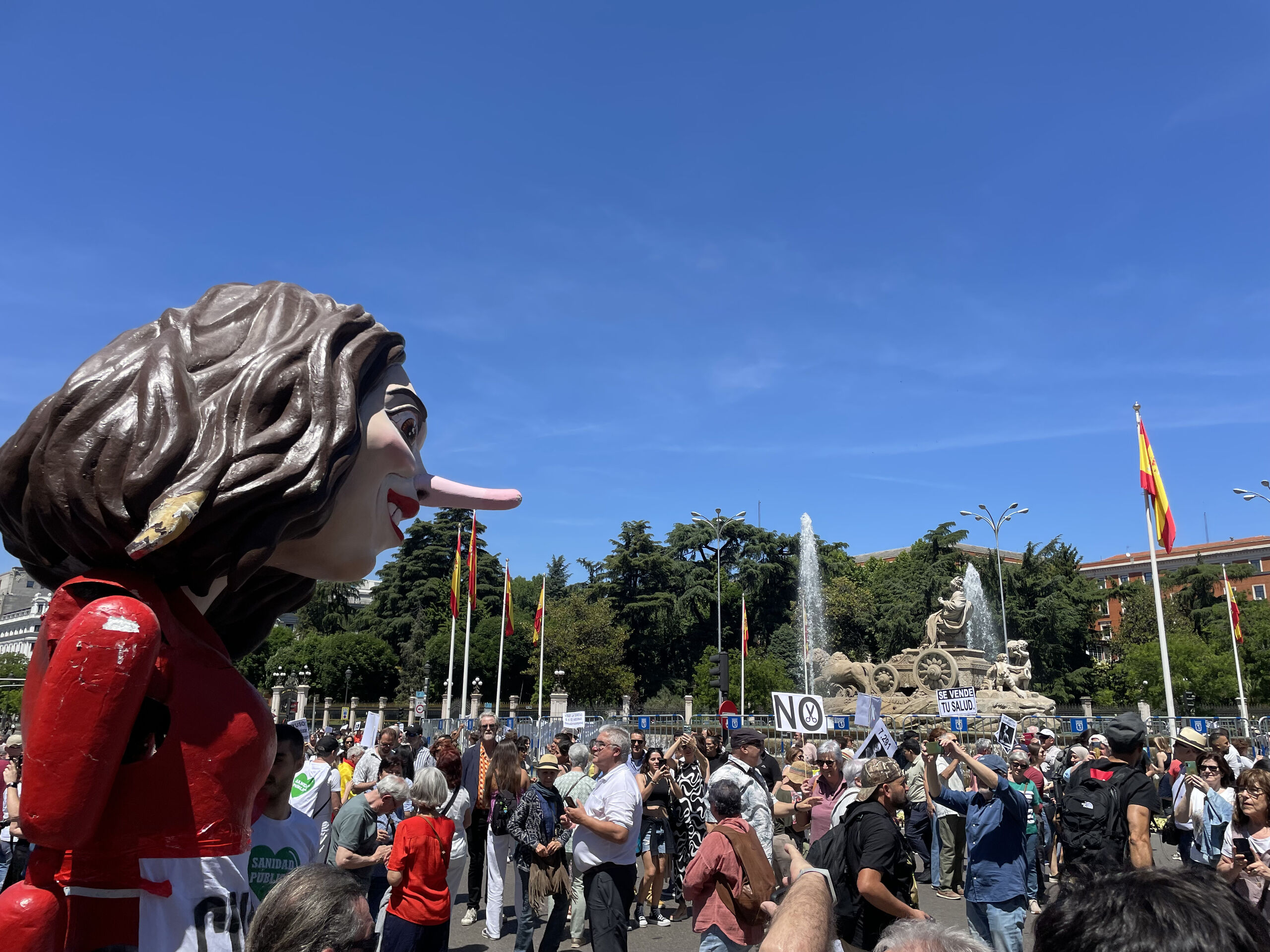 El muñeco que representa a la presidenta madrileña y que ha liderado la columna sur llega a Cibeles, donde ha finalizado la manifestación. Esta ha contado con 200.000 personas si nos guiamos por los números de los organizadores y 30.000 personas según Delegación de Gobierno.