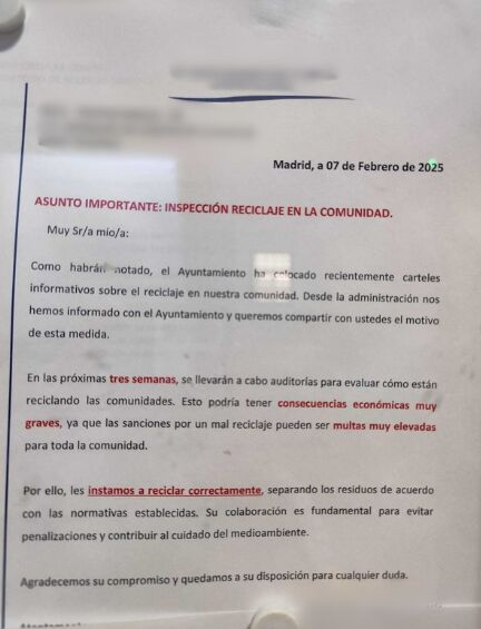 El Gobierno municipal ha avisado a las comunidades de la inspección a través de carteles informativos en los espacios comunes. Así lo confirman desde las propias Administraciones de Fincas, que han remitido una nueva carta a los propietarios para informar sobre el examen. "En las próximas tres semanas, se llevarán a cabo auditorías para evaluar cómo están reciclando las comunidades", comienza la misiva que ha recibido una comunidad del barrio de Estrella, en el distrito madrileño de Retiro.