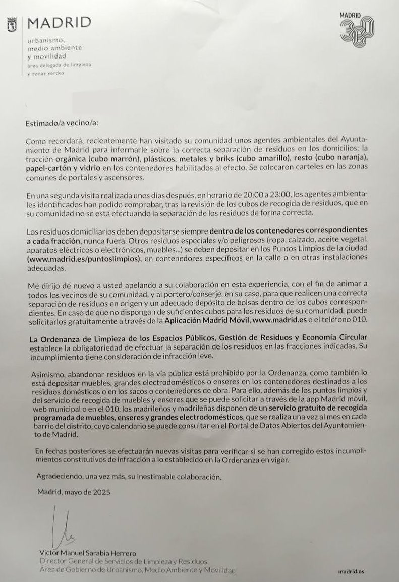 En el escrito, firmado por el director general de Servicios de Limpieza y Residuos, Víctor Manuel Sarabia Herrero, se informa a los vecinos de que, después de varias visitas, "los agentes ambientales identificados han podido comprobar, tras la revisión de los cubos de recogida de residuos, que en su comunidad no se está efectuando la separación de los residuos de forma correcta".